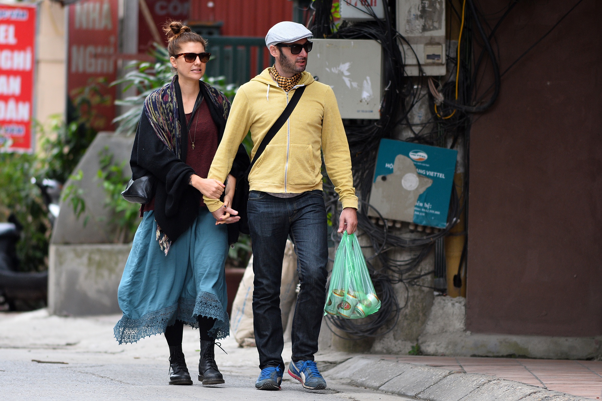 | Hai vị khách nước ngoài tay trong tay trên đường từ siêu thị về nhà. |