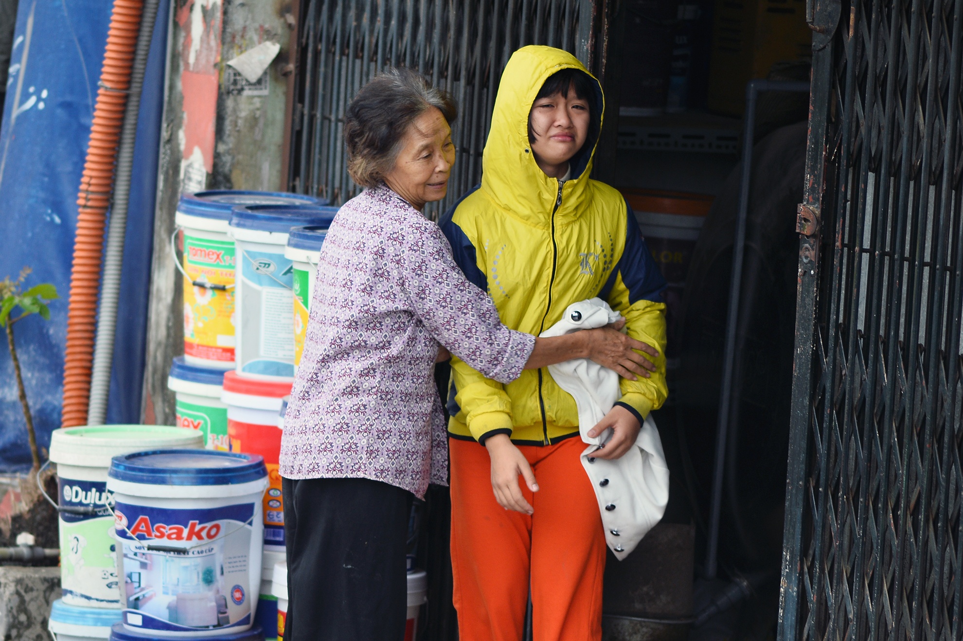 Chị công nhân môi trường đô thị cố gắng kéo kín cổ bộ đồng phục, tiếp tục làm việc.