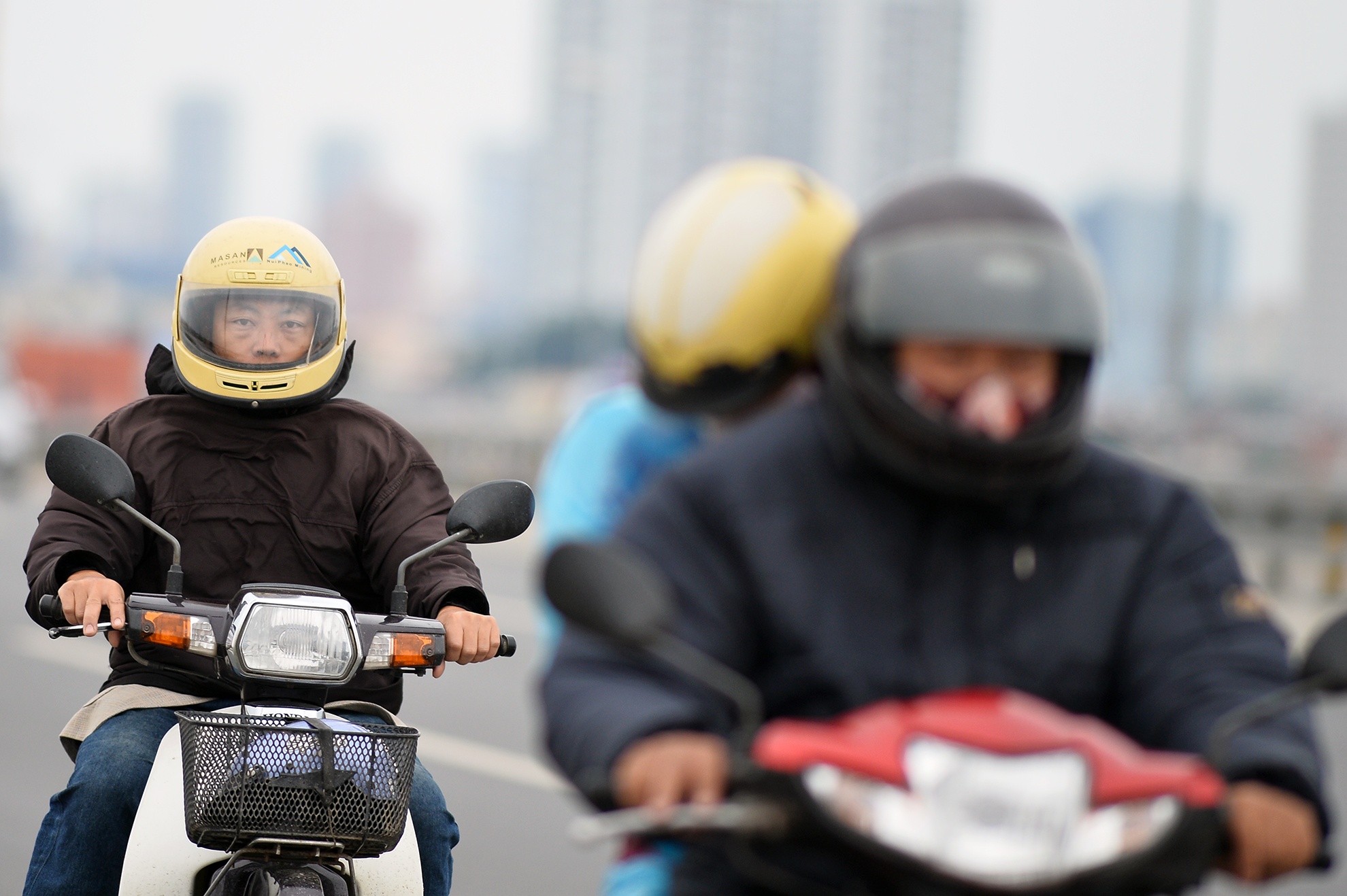 | Khoảng 13h chiều, gió khá mạnh. Người đi xe máy trên cầu Nhật Tân vừa phải chịu lạnh, vừa liêu xiêu tay lái. |