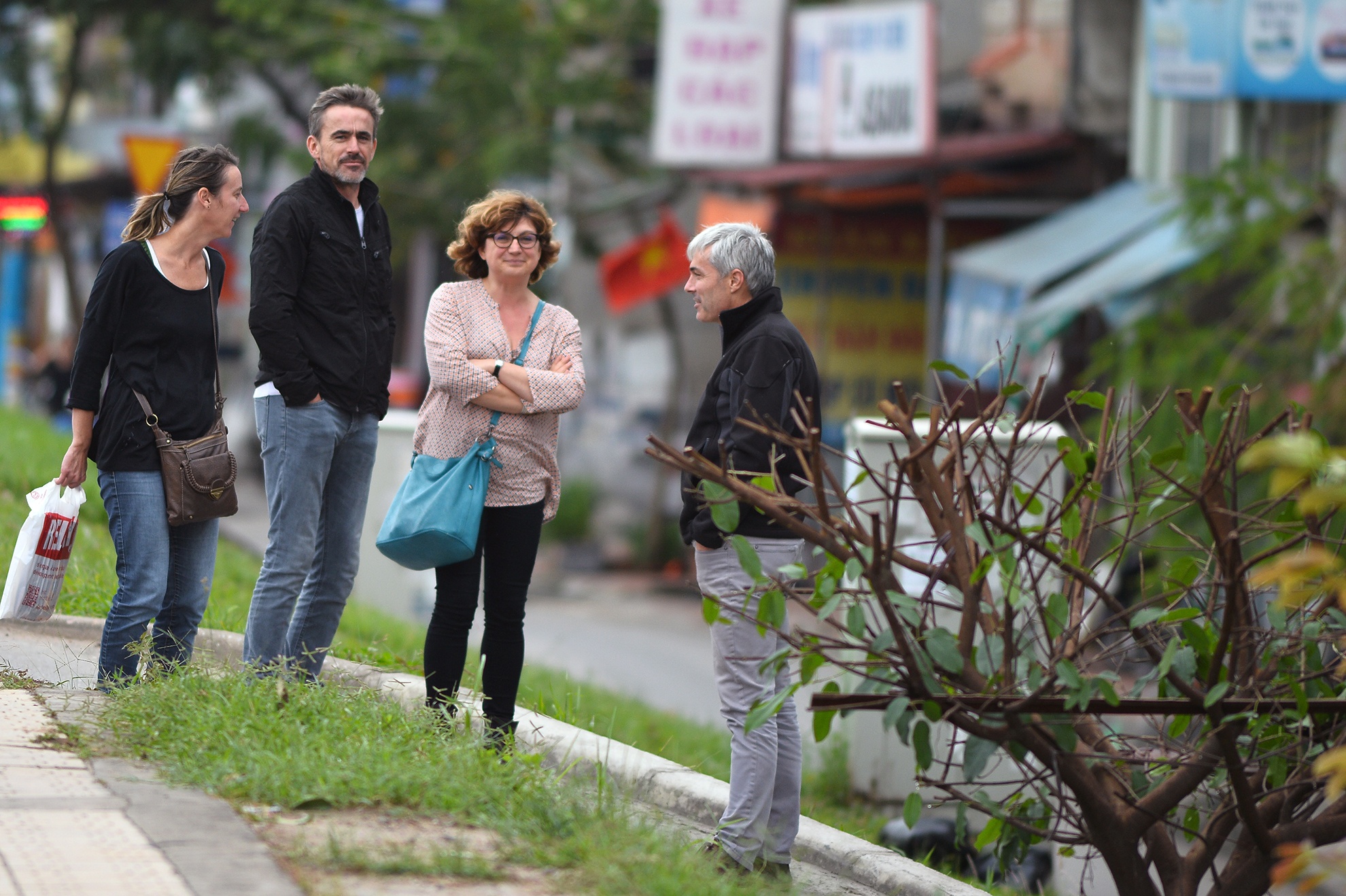 Nhóm khách du lịch của chị Sophie (đến từ Pháp) co ro đứng trong gió đợi xe ra sân bay Nội Bài về nước.