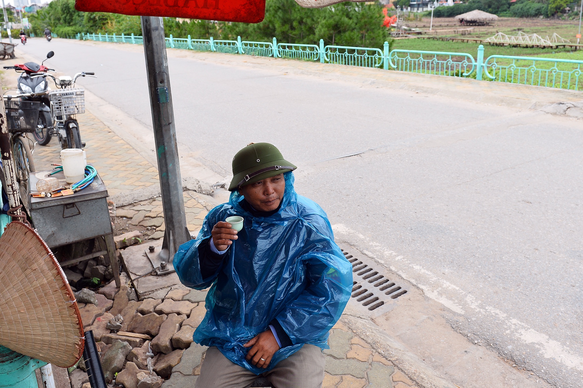 | Anh Hùng, nhân viên bảo vệ một nhà hàng ở Tây Hồ mặc áo mưa trông xe cho khách. |