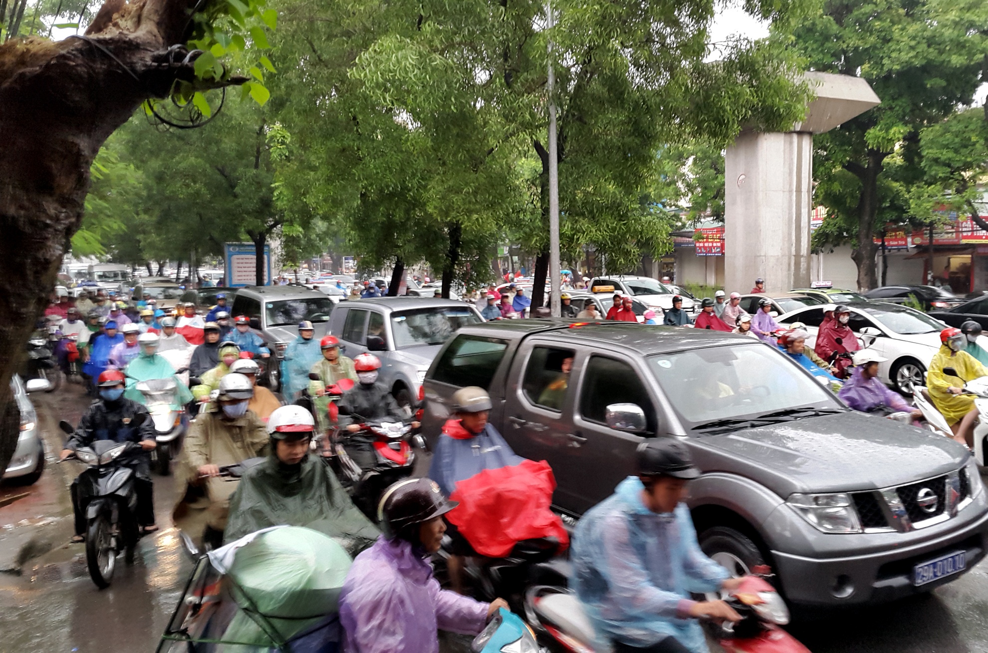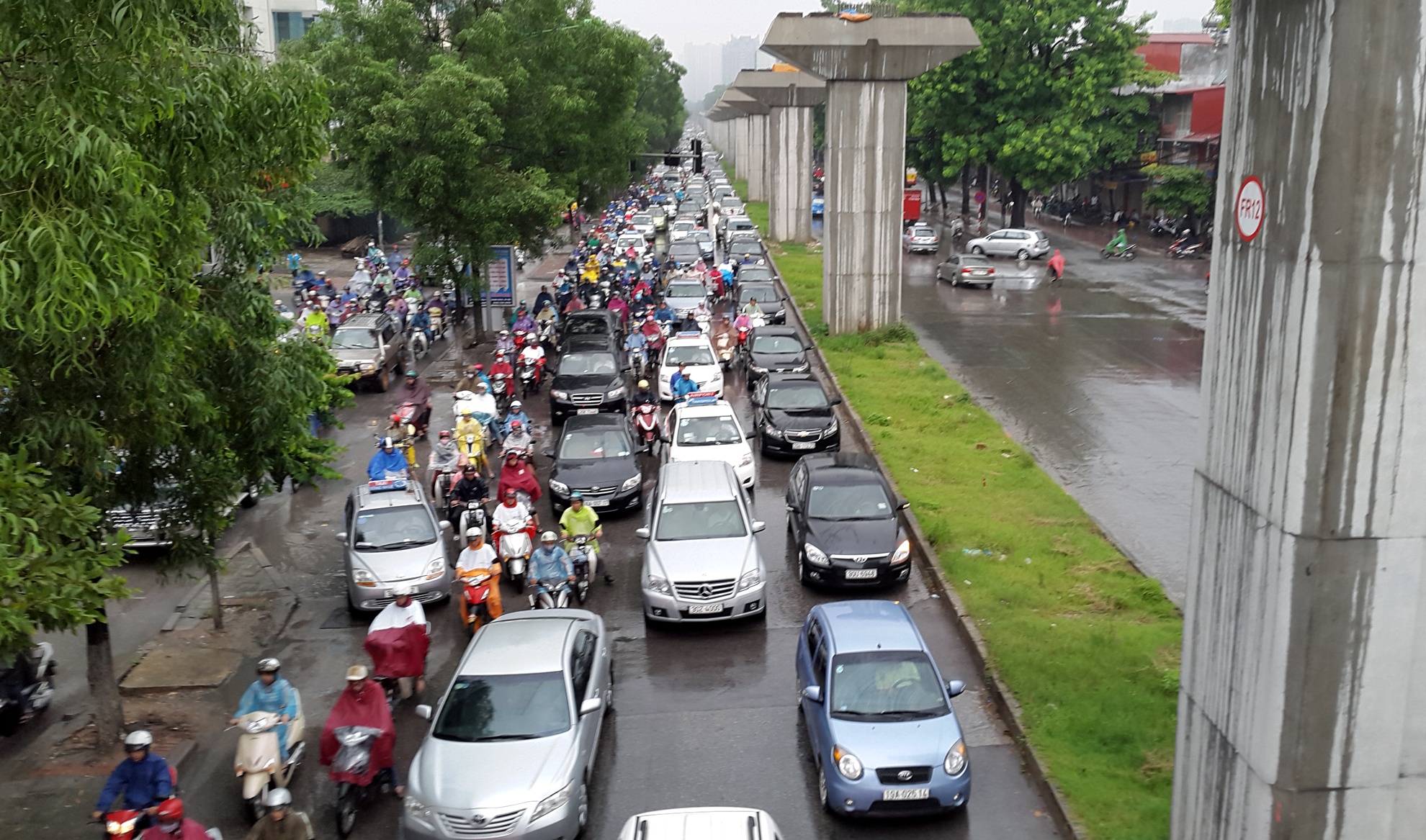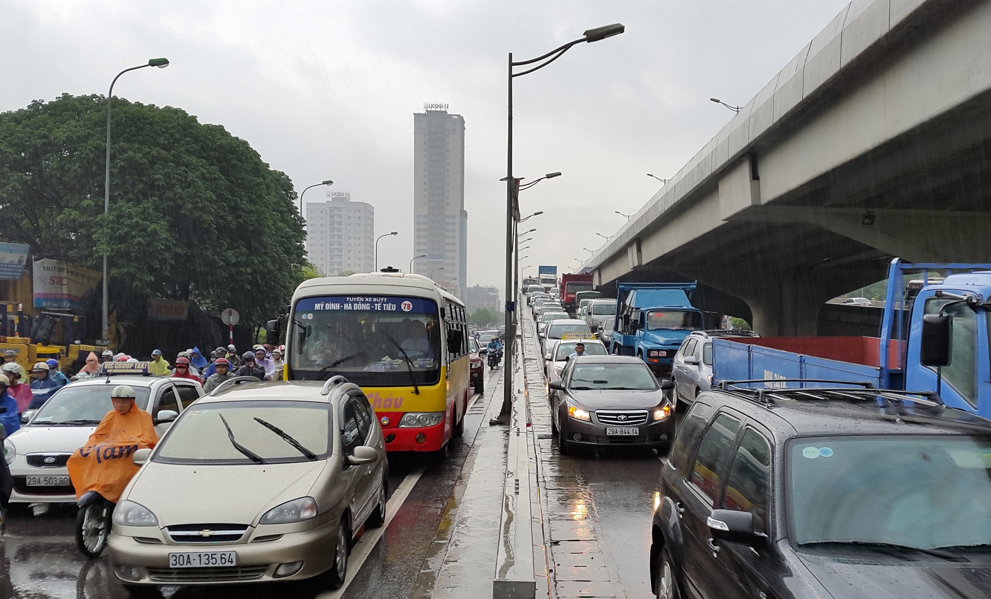 | Suốt chiều dài tuyến này từ ngã ba Kim Giang tới đường Trần Phú, quận Hà Đông (khoảng 7 km) các phương tiện nhích từng mét trong mưa. |