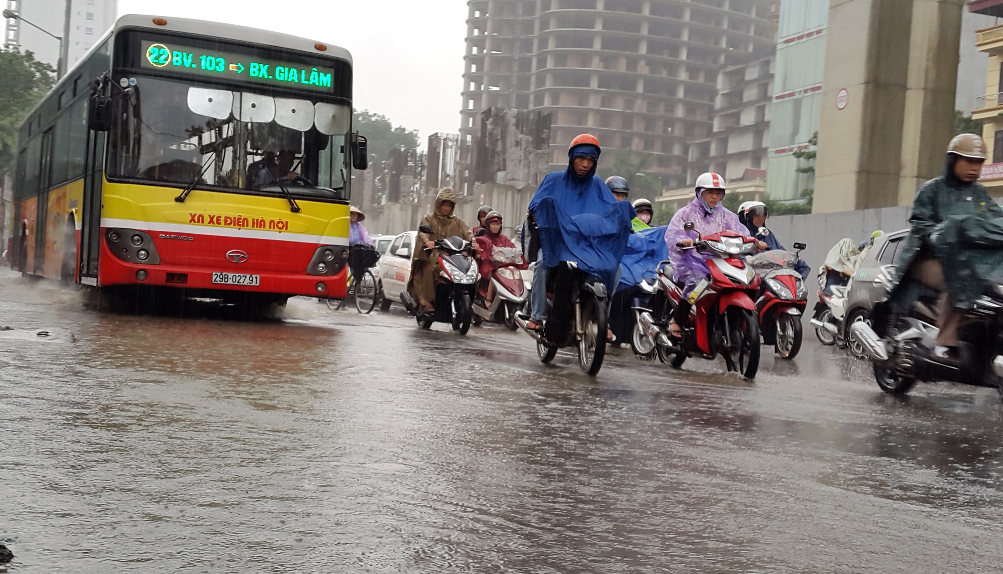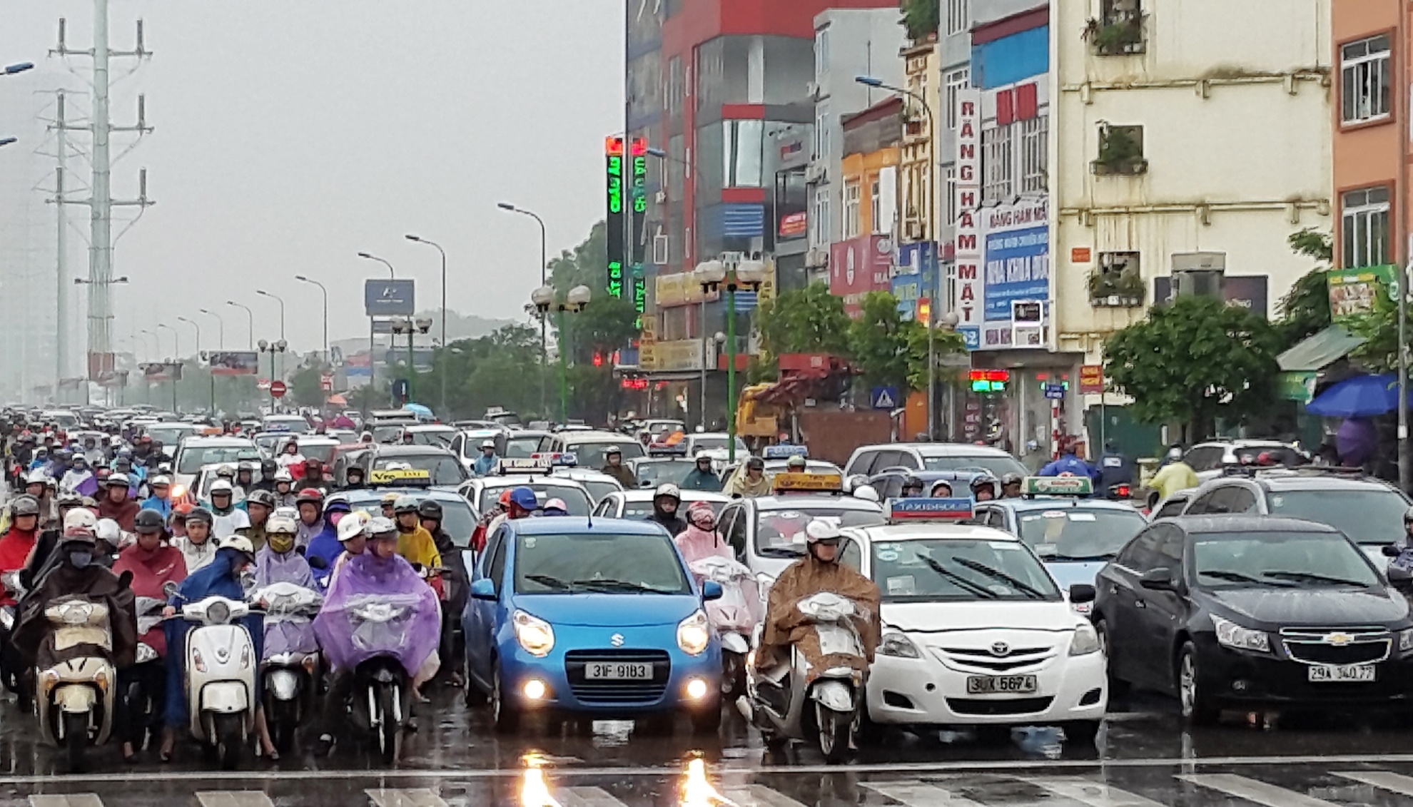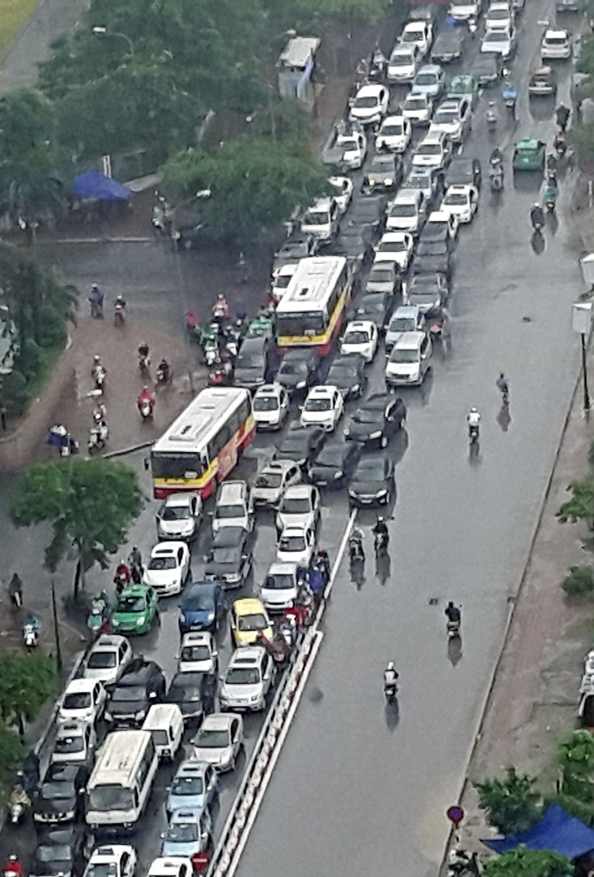 | Suốt chiều dài tuyến này từ ngã ba Kim Giang tới đường Trần Phú, quận Hà Đông (khoảng 7 km) các phương tiện nhích từng mét trong mưa. |