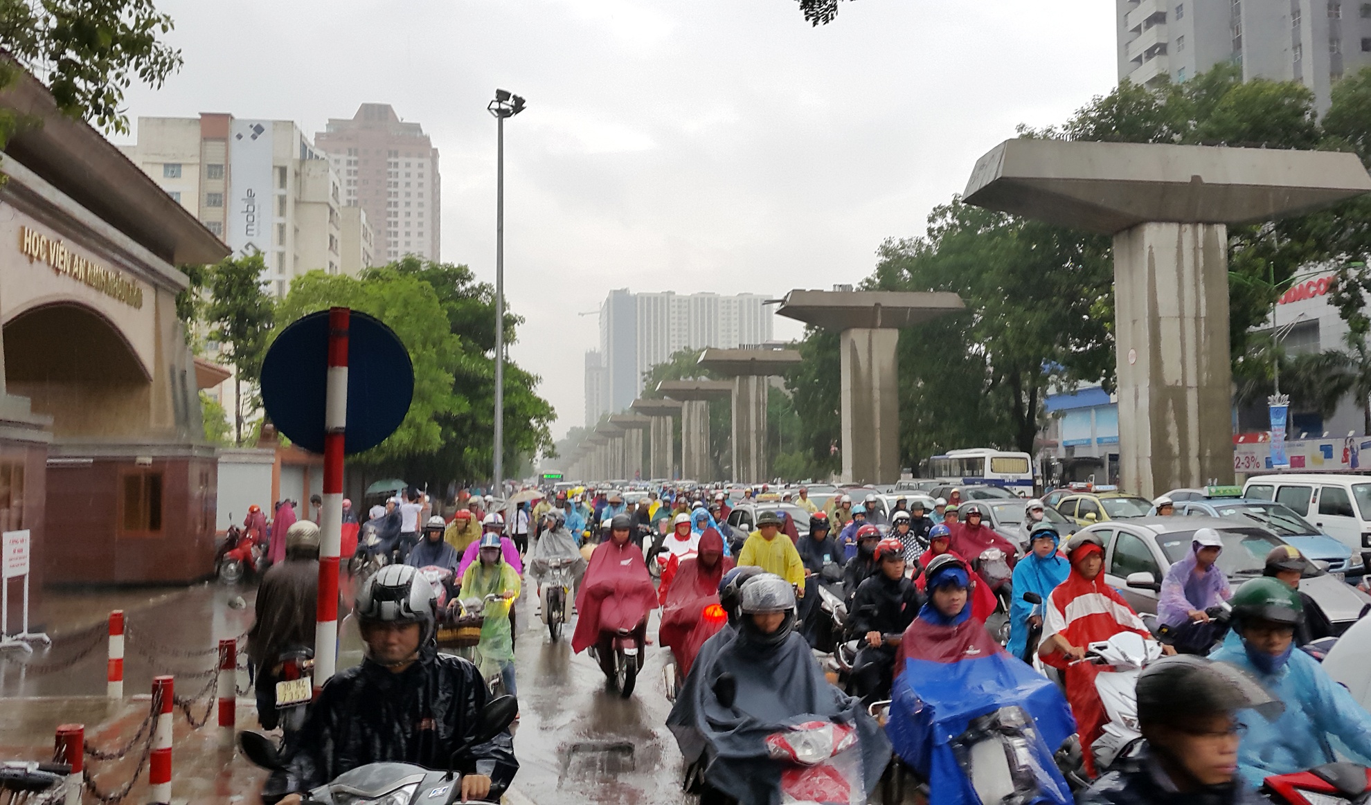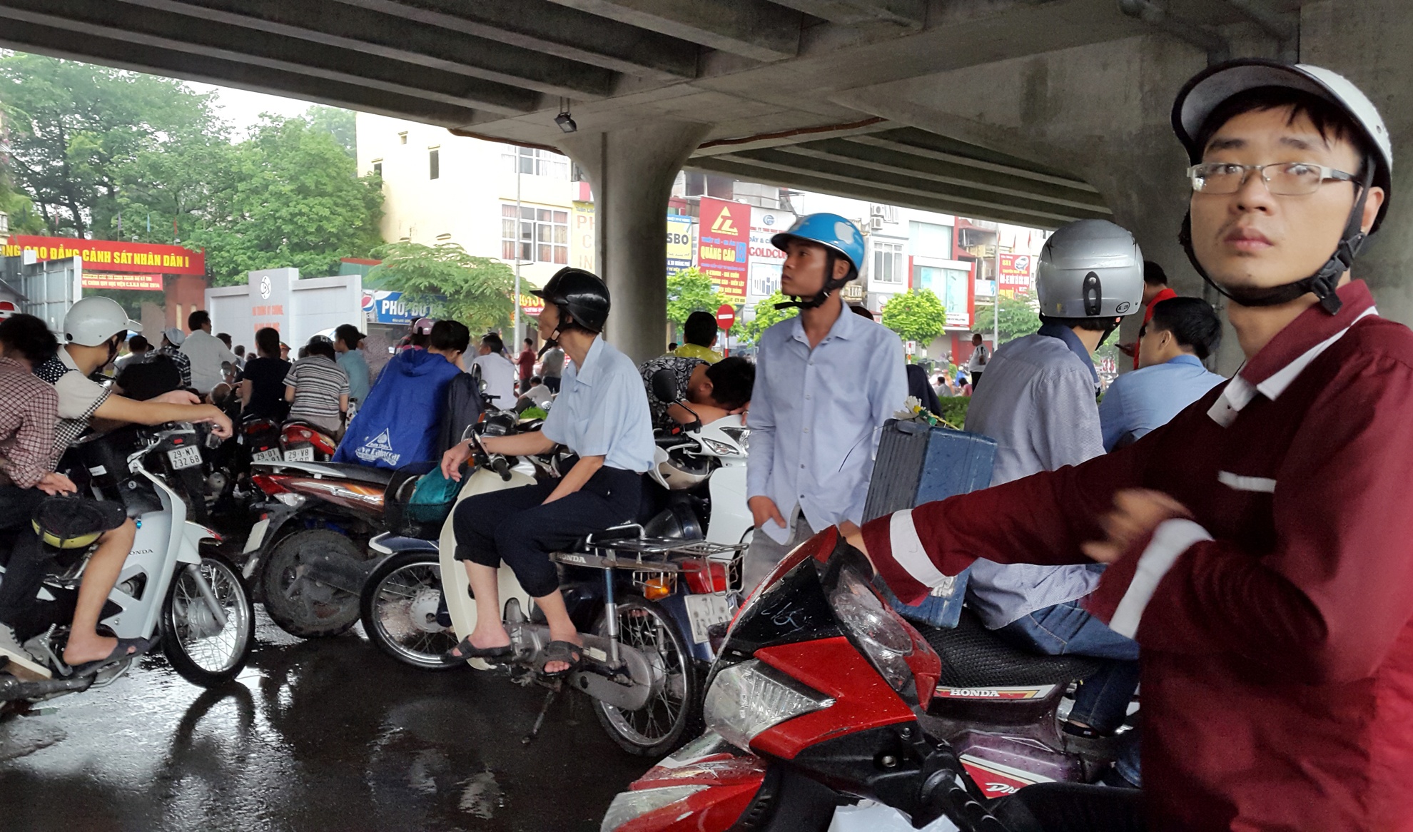 | Gầm đường trên cao vành đai 3 thành nơi trú mưa cho người nhà sĩ tử đoạn trước cổng trường Cao đẳng Cảnh sát Nhân dân. |