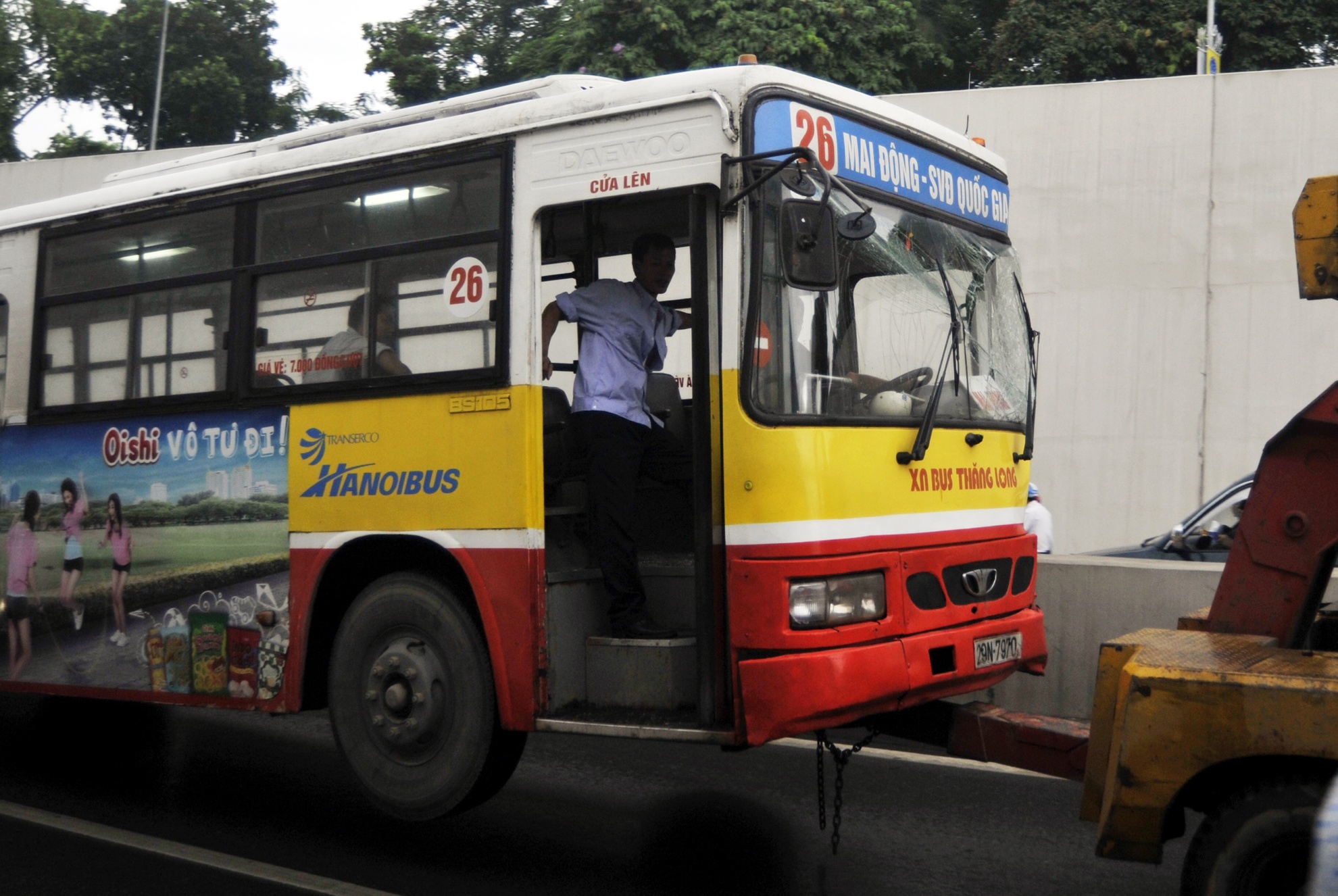 | 6h30 sáng 8/7, một chiếc xe buýt tuyến số 26 của Xí nghiệp xe buýt Thăng Long chạy hướng Kim Liên - Đại Cồ Việt khi đến giữa hầm bị mất lái lao vào một phần thành khiến kính vỡ và móp méo thành xe. |