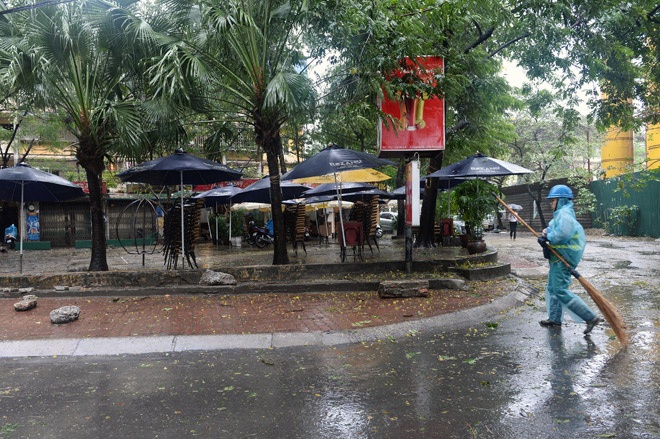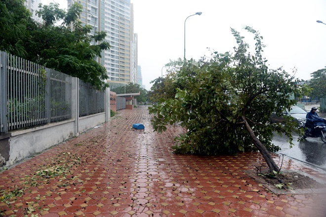 Cây đổ, biển quảng cáo rơi rụng, các cửa hàng đóng cửa, trường học vắng vẻ. Sáng nay Hà Nội có nhiều xáo trộn vì chịu ảnh hưởng của cơn bão số 14.