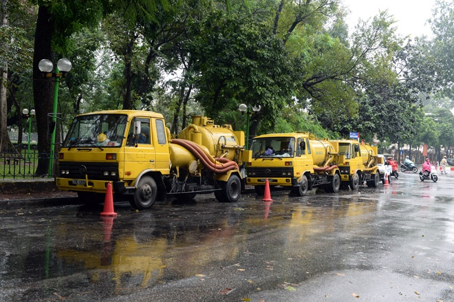 Xe thoát nước túc trực từ đêm đề phòng ngập tại ngã tư Nguyễn Tri Phương - Điện Biên Phủ.
