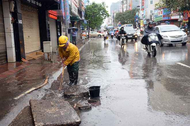 Công nhân thoát nước liên tục khơi thông dòng chảy đảm bảo giao thông. Đường phố không đông đúc như mọi ngày vào giờ cao điểm.