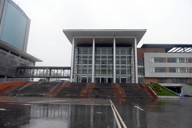 Một trong những ngôi trường ở Hà Nội vắng vẻ vì bão.