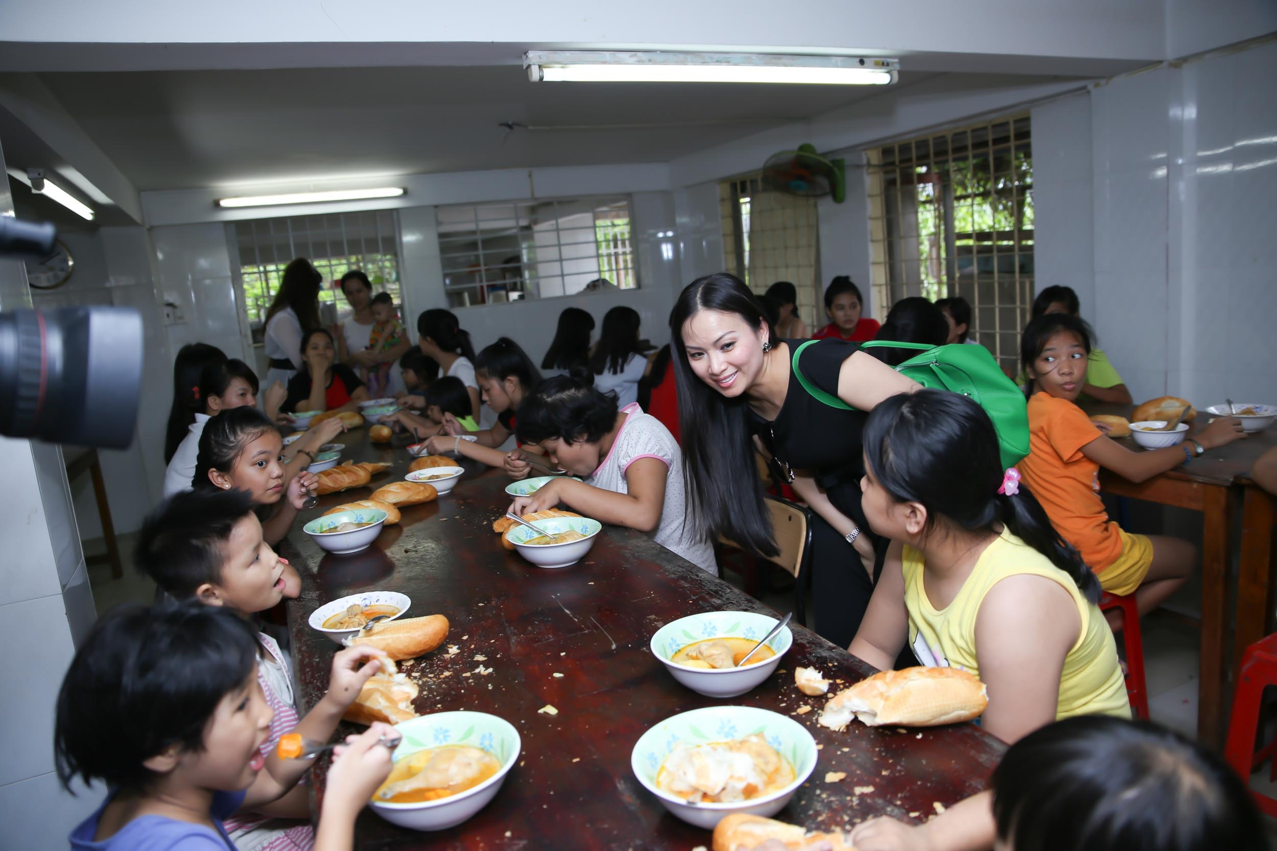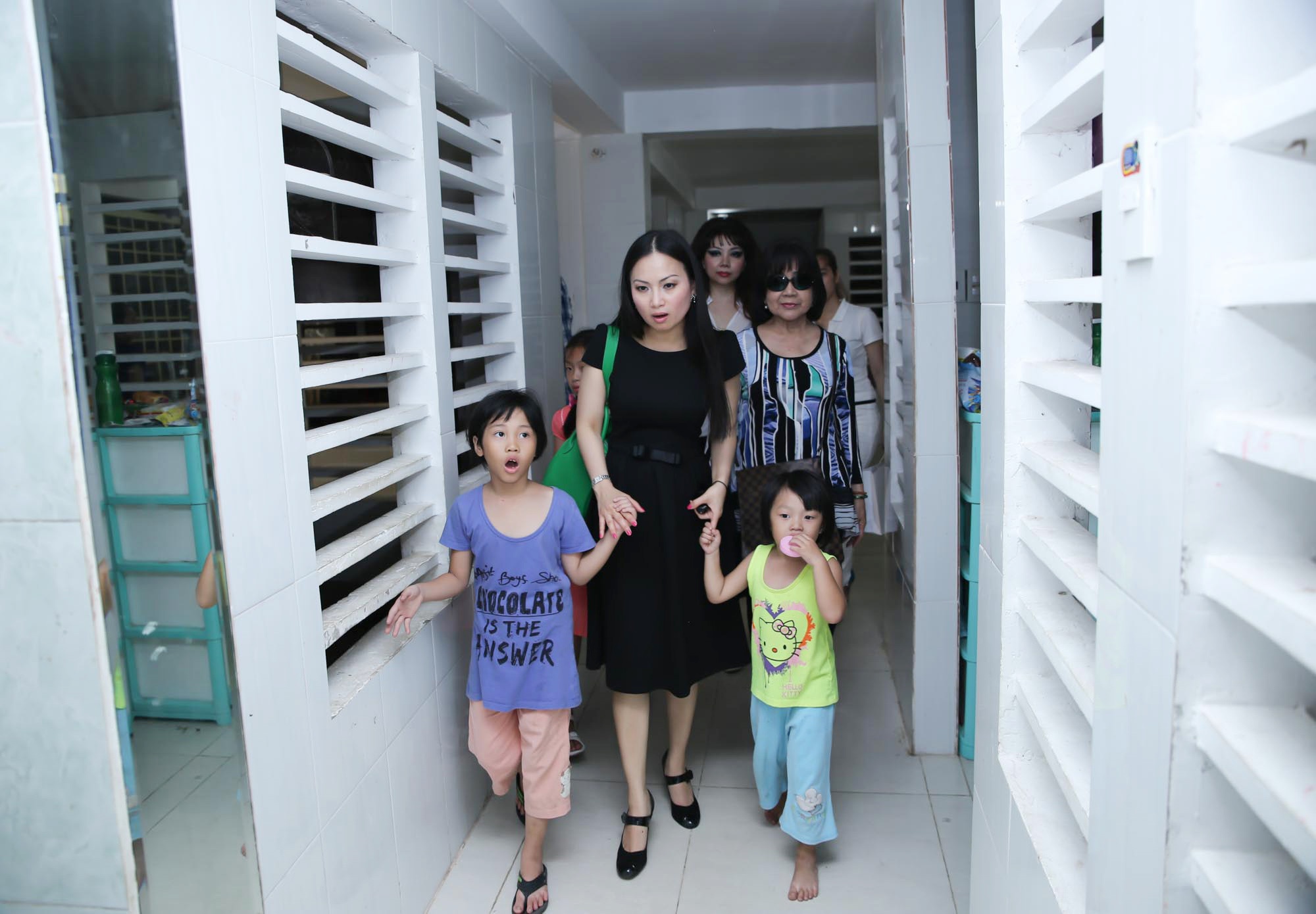 | Các bé dẫn nữ ca sĩ đến thăm nơi sinh hoạt chung. Dù nhiều lần thăm chùa, nhưng người đẹp vẫn xúc động khi chứng kiến cuộc sống khó khăn và mong ước được chia sẻ tình thương từ các trẻ mồ côi nơi đây. |