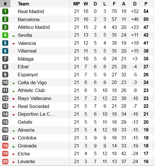 Bảng xếp hạng đầy đủ sau 21 vòng đấu tại La Liga.