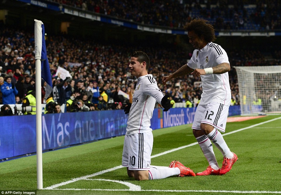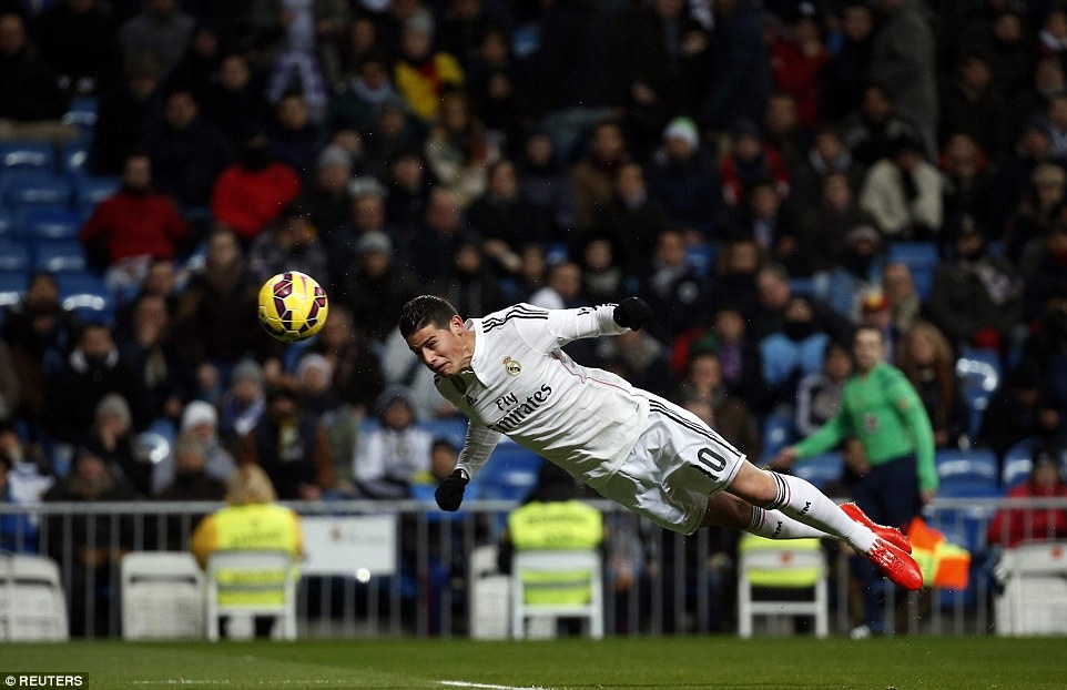 Phút 12, James Rodriguez bay người đánh đầu mở tỷ số cho Real Madrid sau đường chuyền của Marcelo.