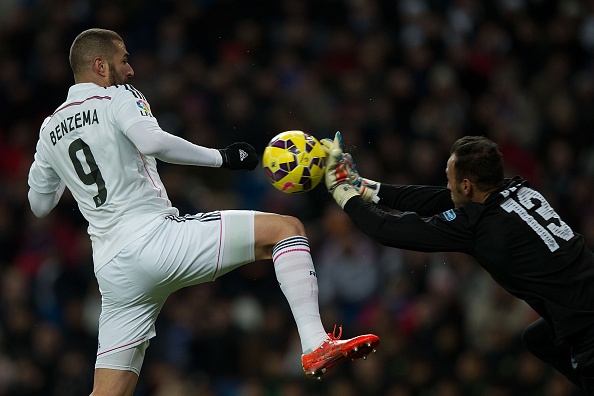 | Phút 34, thủ thành Antonio Alberto Bastos của Sevilla có pha va chạm rất mạnh với tiền đạo Karim Benzema bên phía đội chủ nhà. |