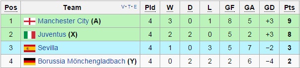 Trong khi, thầy trò Pellegrini đã chính thức giành vé vào vòng knock-out khi nắm trong tay 9 điểm sau 4 lượt trận. Trong trường hợp Man City thua cả 2 trận còn lại và Sevilla giành trọn 6 điểm, đội bóng nước Anh vẫn xếp trên nhờ thắng đối đầu - yếu tố đầu tiên được tính đến khi các đội bằng điểm ở vòng bảng.