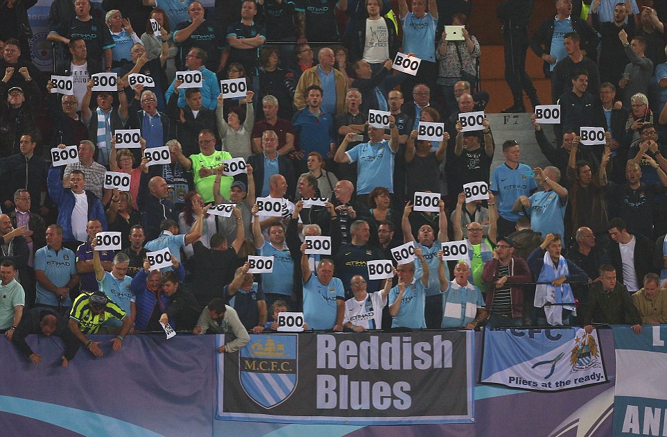 Bất chấp án phạt mới đây của Liên đoàn bóng đá châu Âu (UEFA), các cổ động viên Man City vẫn có hành động phản đối khi nhạc hiệu Champions League vang lên trước giờ bóng lăn.