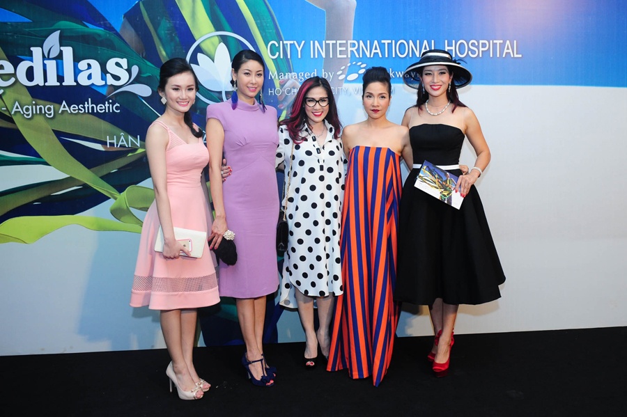 Hà Kiều Anh, chuyên gia trang điểm Hạ My, Mỹ Linh, Thu Hương và vũ công Mỹ An nổi bật trên thảm đỏ.