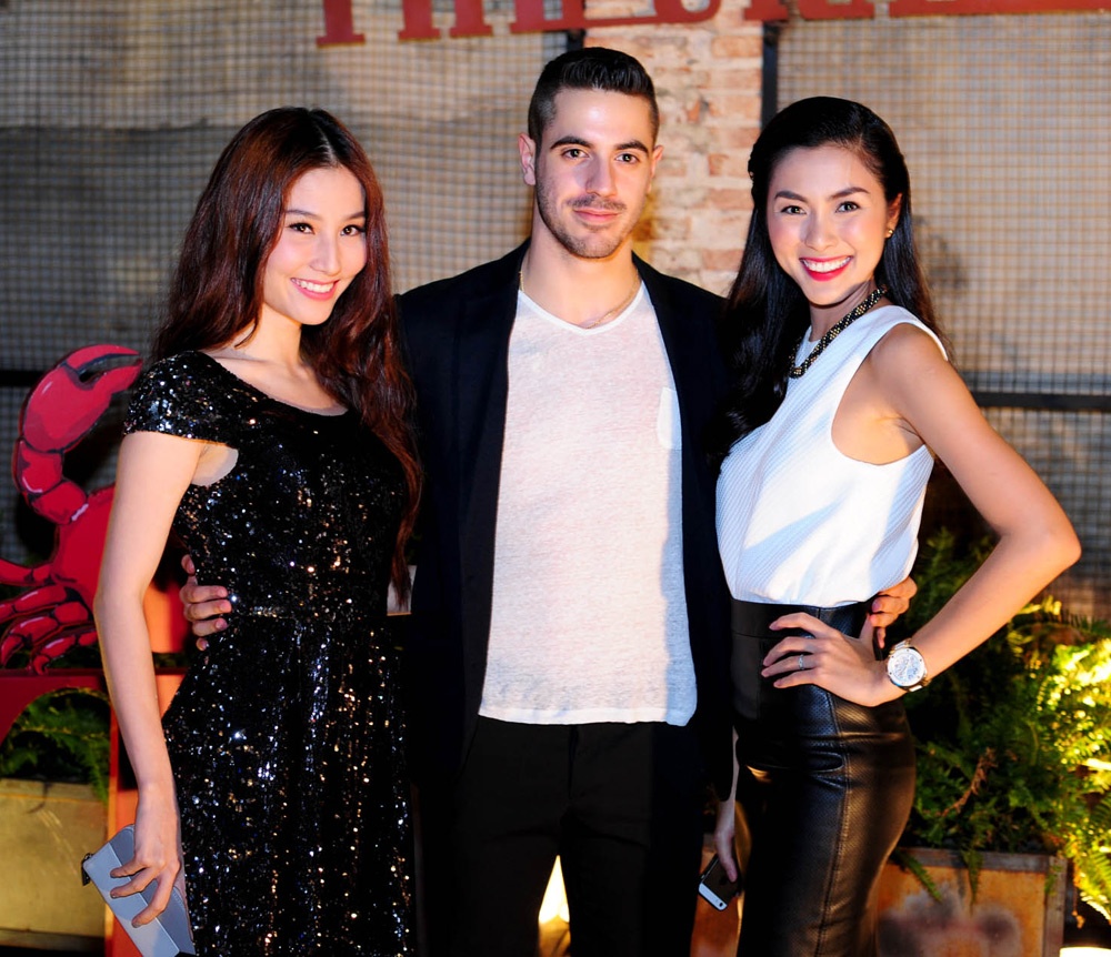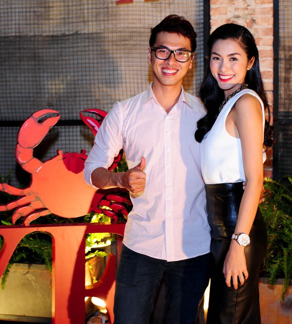 Không chỉ có sự hiện diện đông đủ của gia đình nhà chồng, tối 20/2, rất nhiều bạn bè nghệ sĩ thân thiết cũng đến mở champagne khai trương nhà hàng Crab Shack của Tăng Thanh Hà. Trong ảnh, nữ diễn viên Diễm My và NTK Đỗ Mạnh Cường diện đồ ton sur ton đến chúc mừng Hà Tăng.