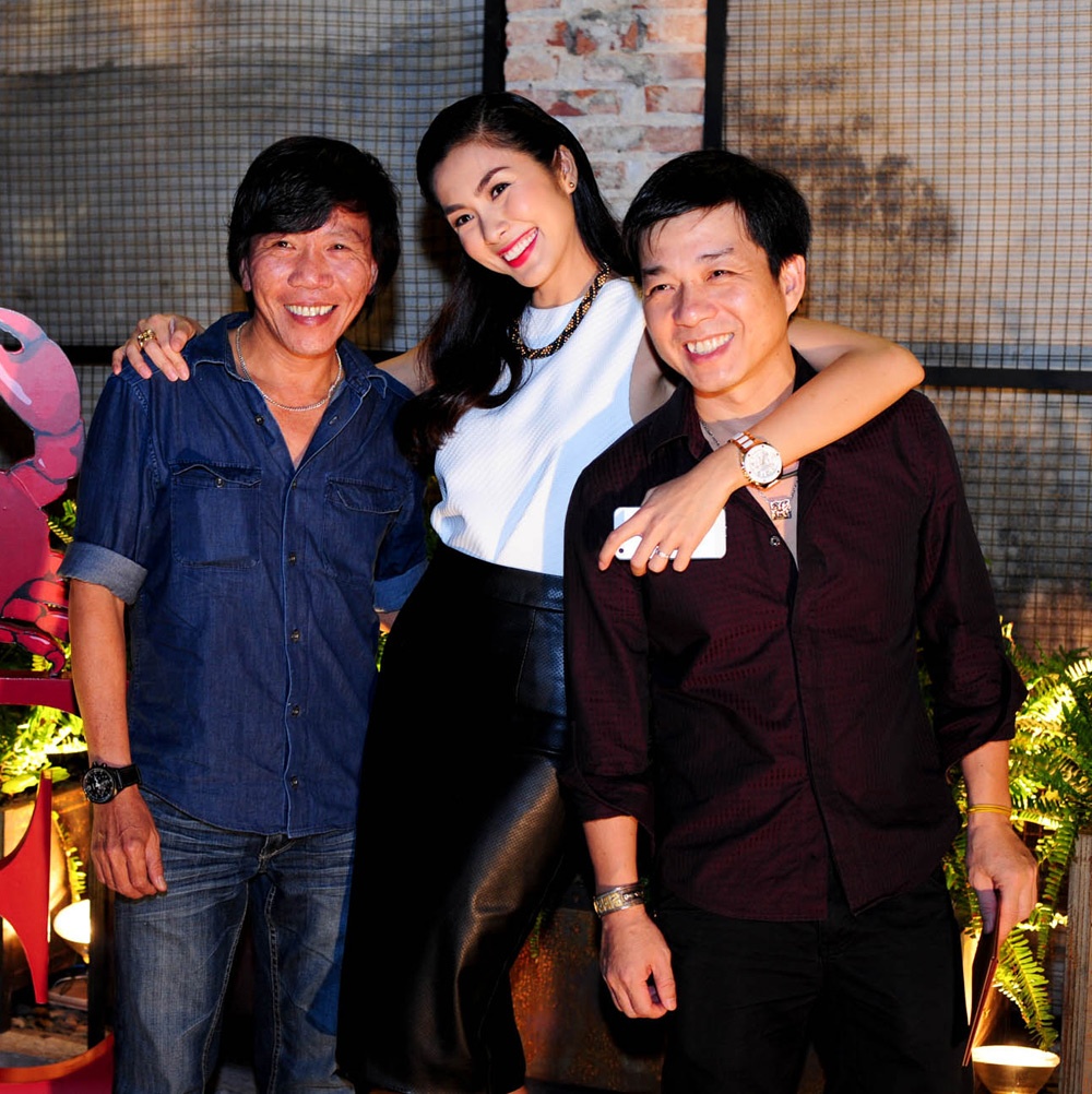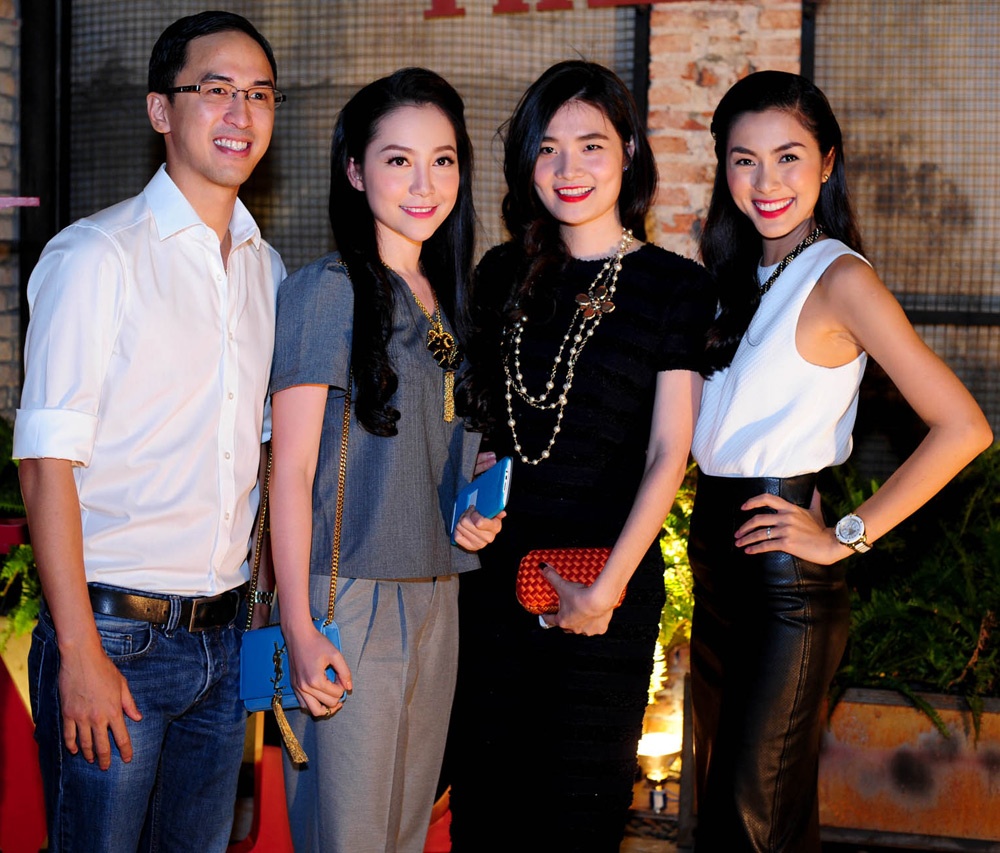 | Bà chủ Tăng Thanh Hà nhí nhảnh bên đạo diễn Đoàn Minh Tuấn và những người bạn. |