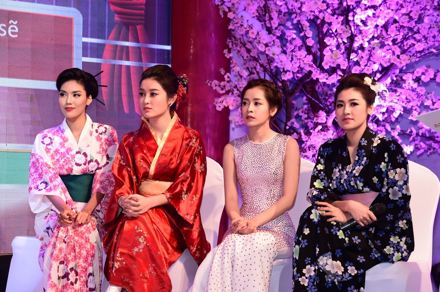 Hoa khôi Lan Khuê diện bộ kimono hoa anh đào và vấn tóc kiểu truyền thống. |