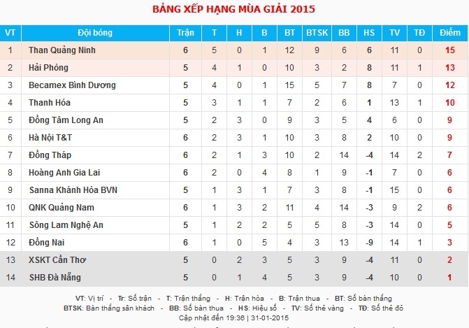 Với 4 trận toàn thắng trên sân khách mùa này, Than Quảng Ninh xứng đáng vượt mặt Hải Phòng để tạm vươn lên ngôi vị số 1 bảng xếp hạng V.League với 15 điểm sau 6 vòng đấu. Trong khi đó, Hoàng Anh Gia Lai có nguy cơ mất vị trí thứ 8 nếu Khánh Hòa, Quảng Nam hoặc Sông Lam Nghệ An giành chiến thắng ở loạt trận muộn.