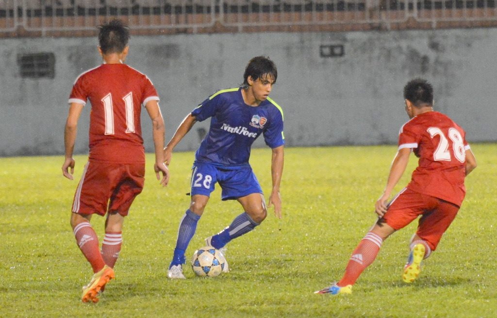 | Văn Toàn (áo xanh) của HAGL thi đấu tích cực khi chơi cùng các ngoại binh. Ảnh: Nguyễn Đăng. |