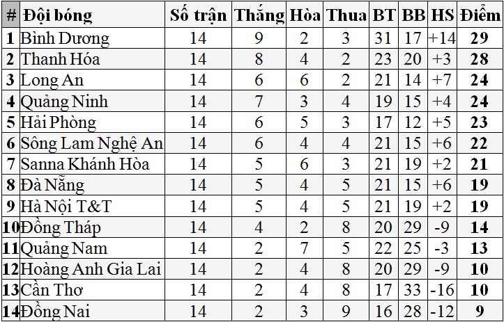 | Bảng xếp hạng vòng 14 V.League 2015. |
