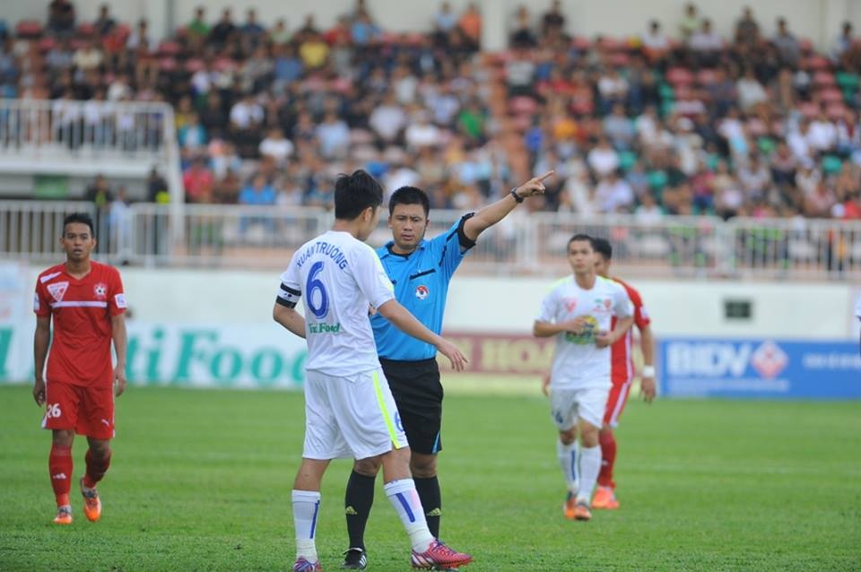 | Xuân Trường khiếu nại tấm thẻ đỏ của Franklin nhưng không thành công. Ảnh: Gia Bảo. |