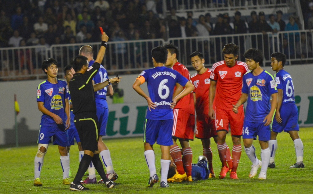 | Trọng tài Võ Quang Vinh ngay lập tức rút thẻ đỏ. HAGL được chơi hơn người trong 14 phút cuối, nhanh chóng ào lên tấn công để tìm thêm bàn thắng. |