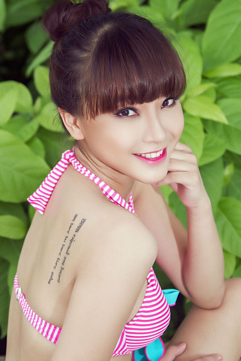 Tuần vừa qua, tranh thủ thời gian đóng máy, cô cùng ê-kíp hình ảnh của mình có buổi shooting ngay tại trung tâm TP.HCM. Trong ảnh, nữ ca sĩ sinh năm 1988 biến hóa với hình tượng ngọt ngào, dễ thương, cô diện bikini nhiều màu sắc rất bắt mắt và lôi cuốn.
