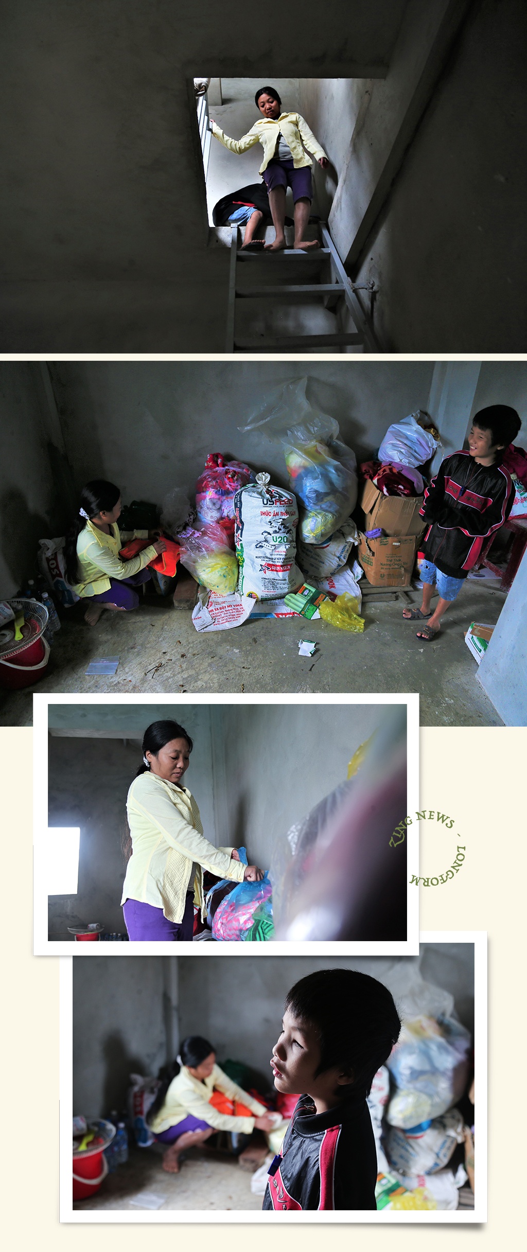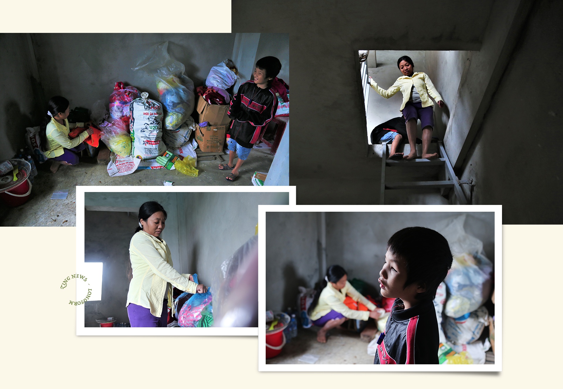 Căn nhà gỗ nhỏ, lợp ngói xiêu vẹo suốt mấy chục năm là nơi trú ẩn của bà cùng cô con gái ốm đau triền miên và đứa cháu trai khiếm thị. Cũng như nhiều ngôi nhà khác của người dân nơi đây, phía trên sát mái nhà bà Hồng có tầng gác được kết từ những tấm gỗ.