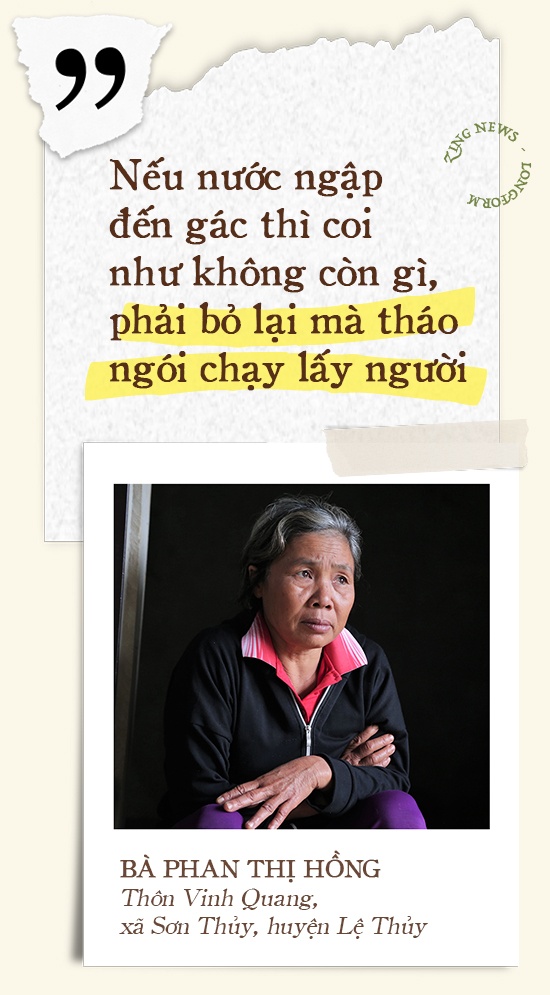 Bà Phan Thị Hồng ở thôn Vinh Quang, xã Sơn Thủy, năm nay đã gần 60 tuổi. Hơn nửa đời người lăn lộn với vùng “rốn lũ”, bà không thể nhớ nổi đã bao nhiêu lần gia đình mình chạy lụt.