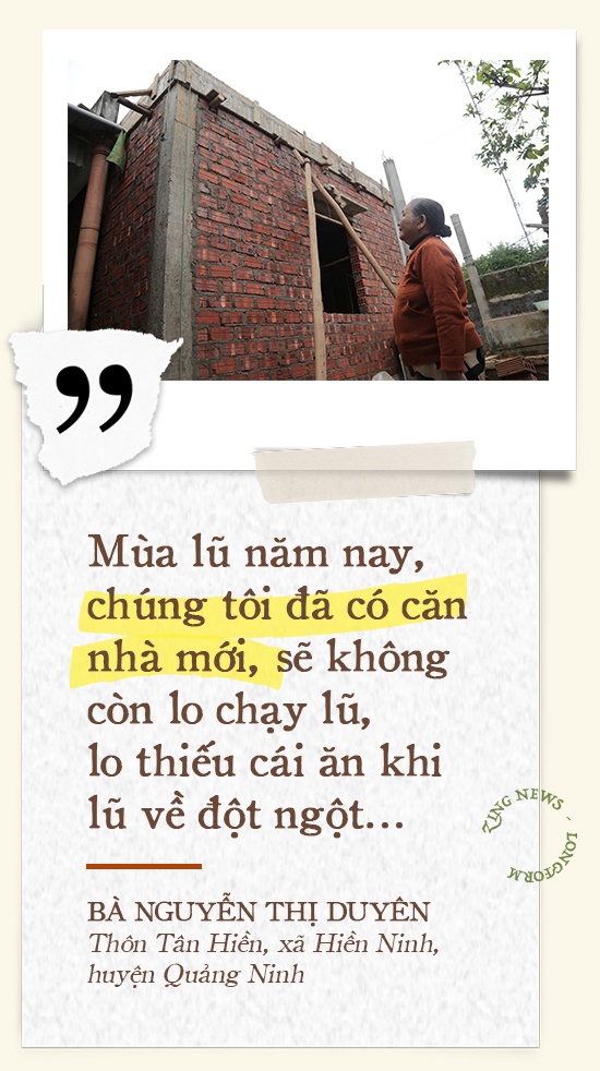 Cách đó hơn 20 km, vợ chồng bà Nguyễn Thị Duyên và ông Trần Ngọc Đào (84 tuổi, thôn Tân Hiền, xã Hiền Ninh, huyện Quảng Ninh) cũng có niềm vui tương tự khi căn nhà an toàn chống chịu bão, lụt đã thành hình.