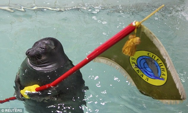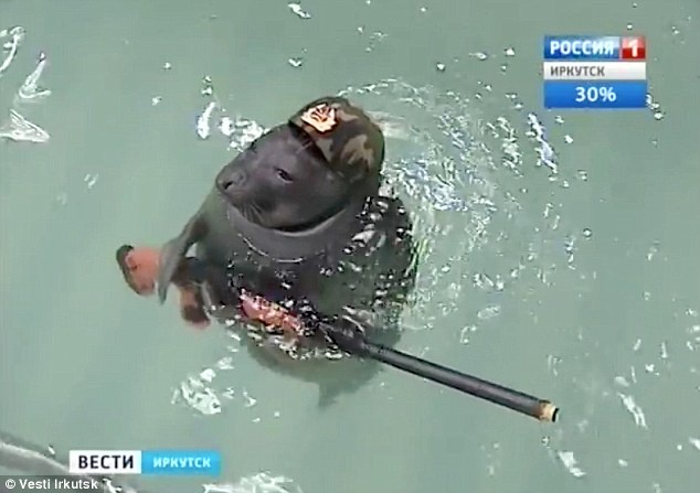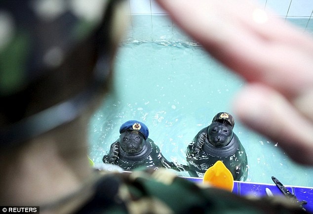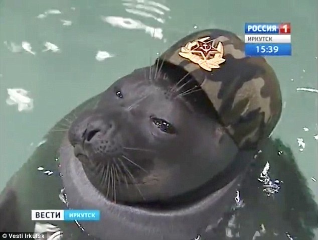 Hải cẩu Winnie the Pooh và Laska đội mũ quân sự, ôm súng và khoe các kỹ năng bắn súng tại một công viên thủy sinh ở Siberia hôm 9/5, trùng với lễ kỷ niệm Ngày Chiến thắng diễn ra tại quảng trường Đỏ ở Moscow, Nga. |