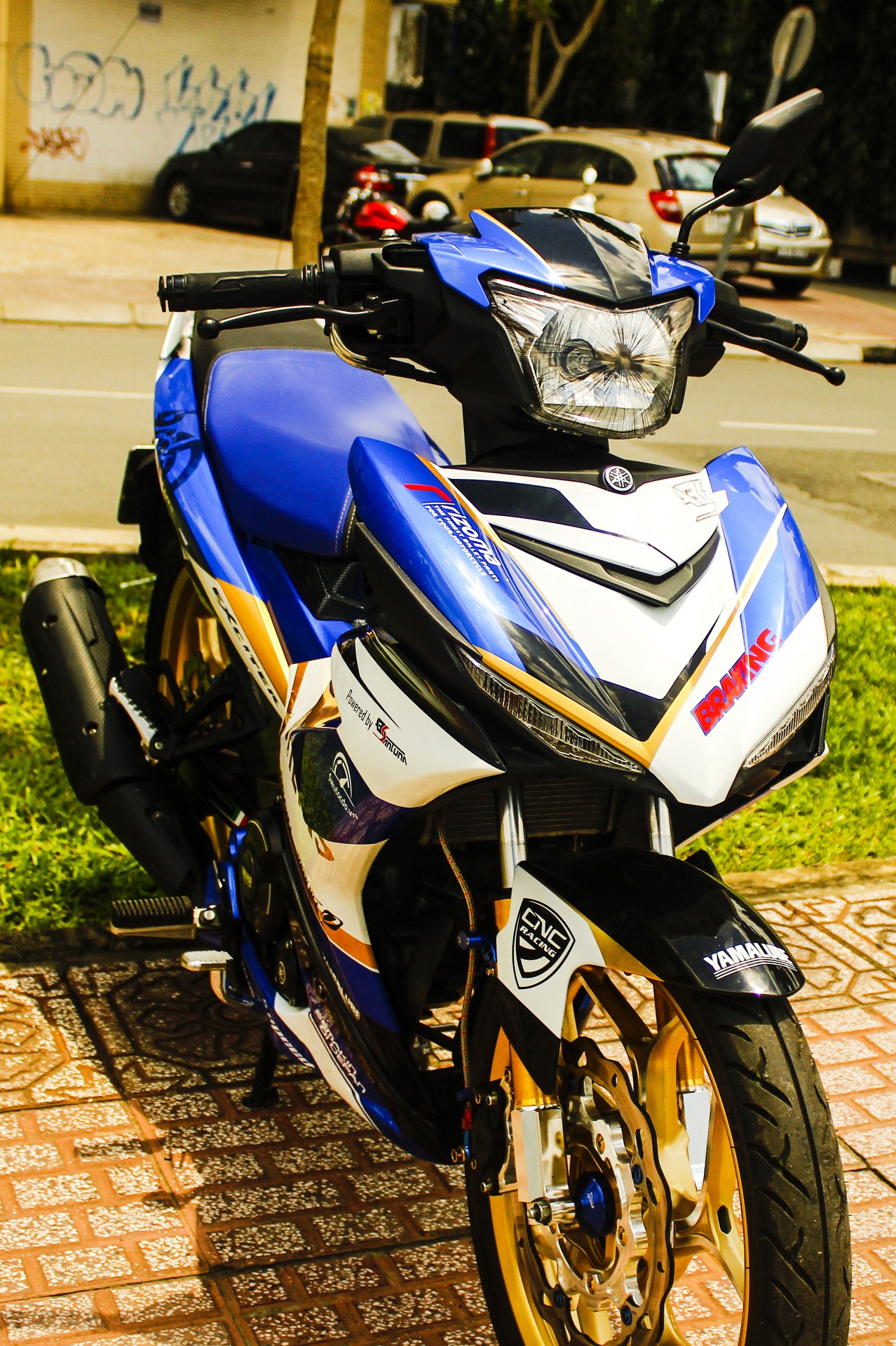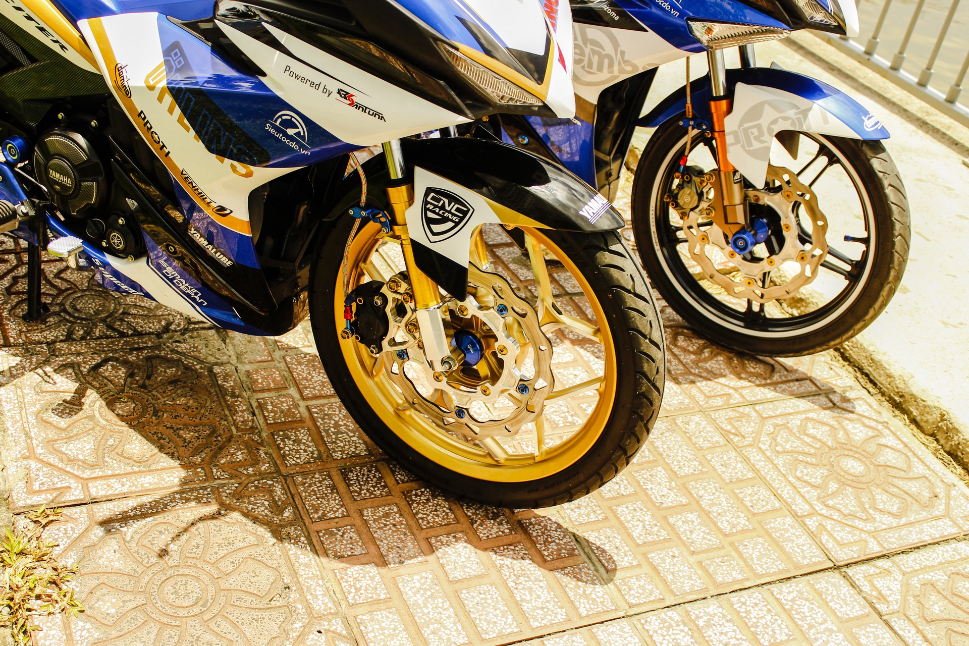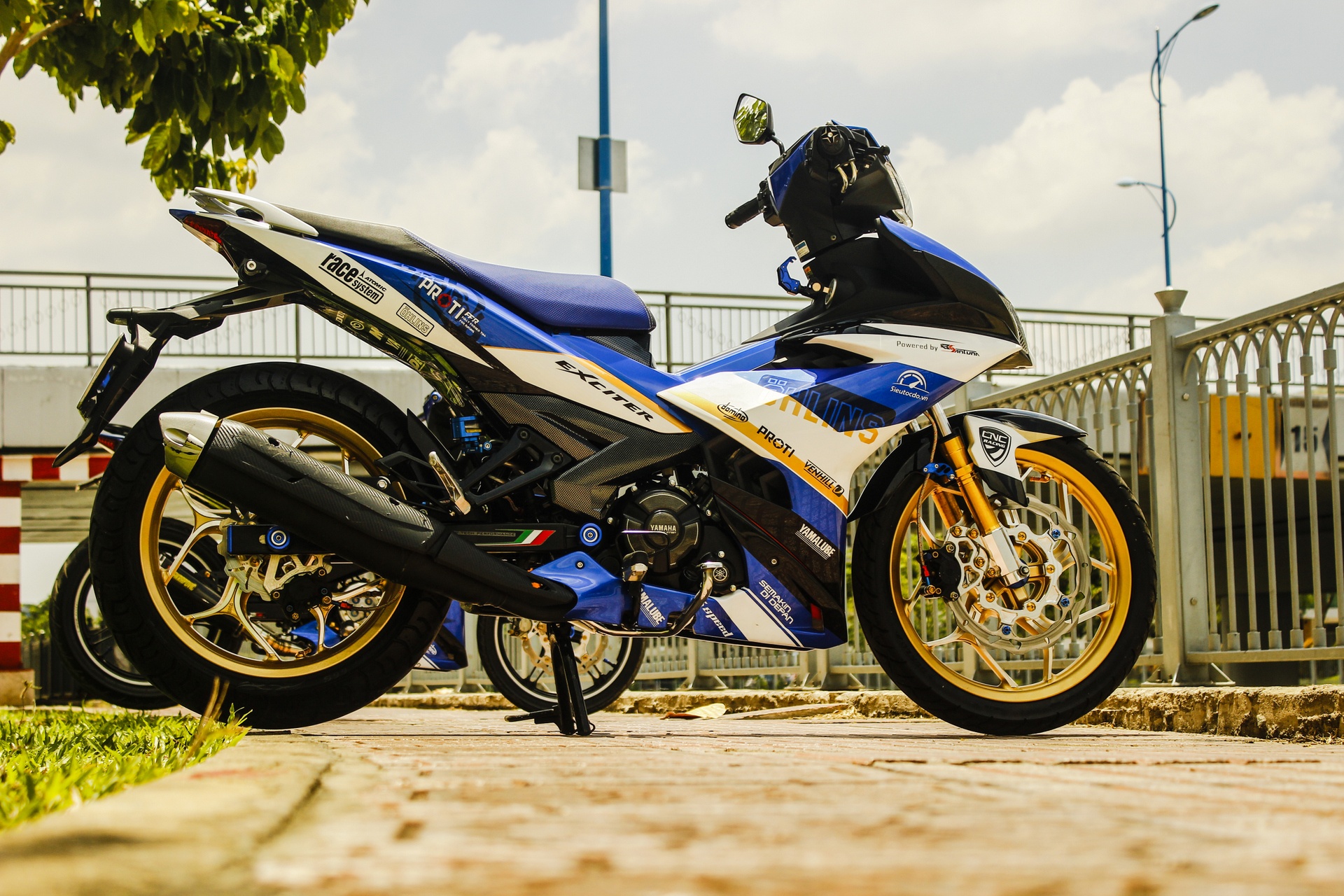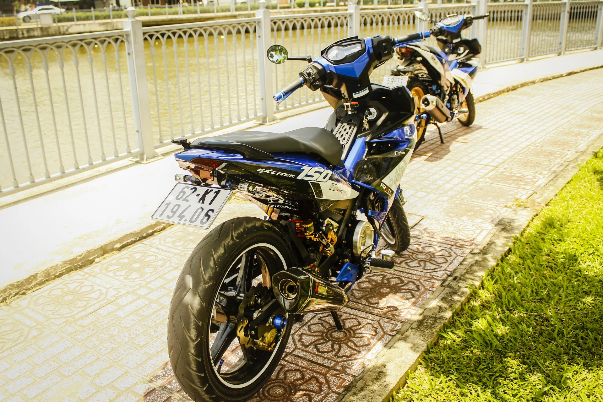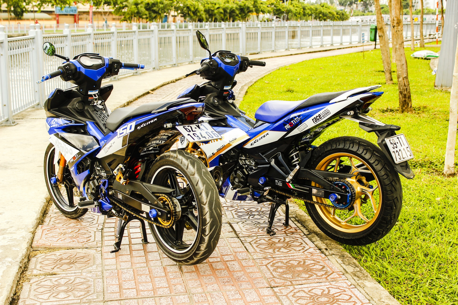 | Hai chiếc Exciter 150 màu xanh GP được chủ nhân độ theo phong cách gần giống nhau. Dàn áo được sơn tem đấu với hai tông màu chủ đạo xanh - trắng. |