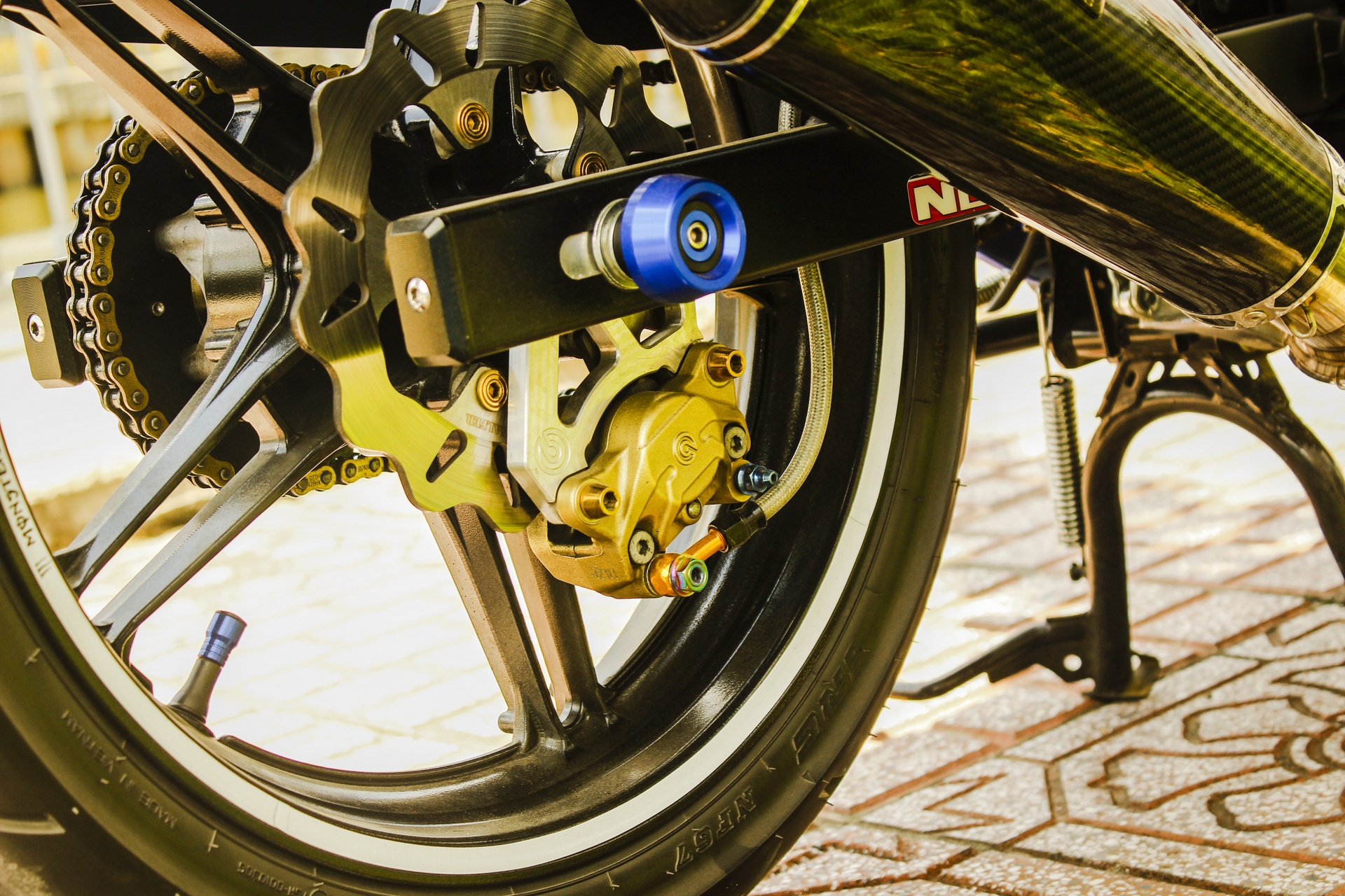 | Những món đồ chơi đáng chú ý phía trước là heo dầu Brembo, đĩa độ, ốc kiểng và cặp phuộc độ. Ngoài ra, chiếc xe phía trước còn được trang bị cặp vành độ màu vàng. |