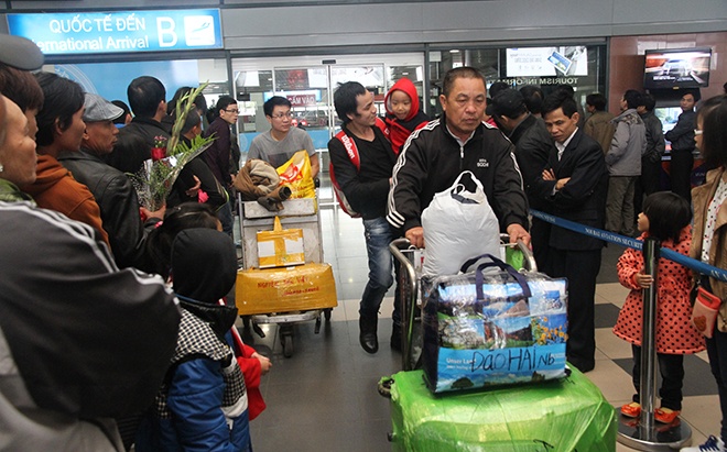 | Đúng 8h sáng, 2 chuyến bay đã hạ cánh an toàn xuống sân bay Nội Bài đưa hàng trăm người Việt Nam kịp về quê ăn Tết. Chuyến bay mang số hiệu VN6579 do cơ truởng Nguyễn Thành Trung điều khiển đã đáp xuống sân bay Nội Bài với 117 hành khách. |