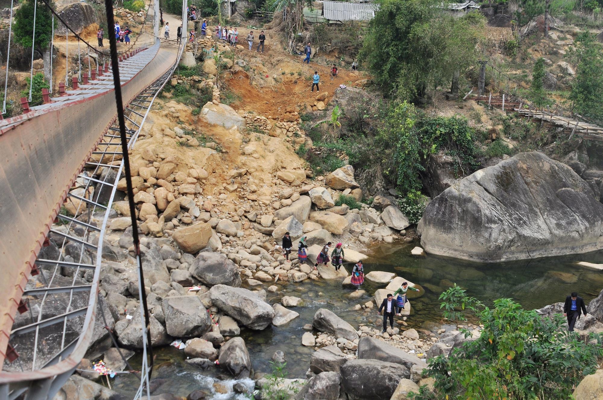 Qua cây cầu treo, nơi thảm họa ập đến, ông Phảng cho biết, bên cạnh đó cũng là một cây cầu treo nhỏ hơn. Những năm trước, dân bản qua lại cây cầu treo sàn gỗ này. Mùa mưa, nước dâng cao sát với sàn cầu. Mặt sàn gỗ lâu ngày mưa mục, mọt bị thủng nhiều mảng lớn. Nhiều trẻ đi học thụt chân xuống, bị thương phải đi cấp cứu. Vì thế trẻ em trong bản từ nhỏ đều được dạy bơi.