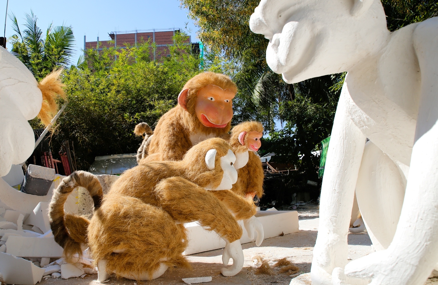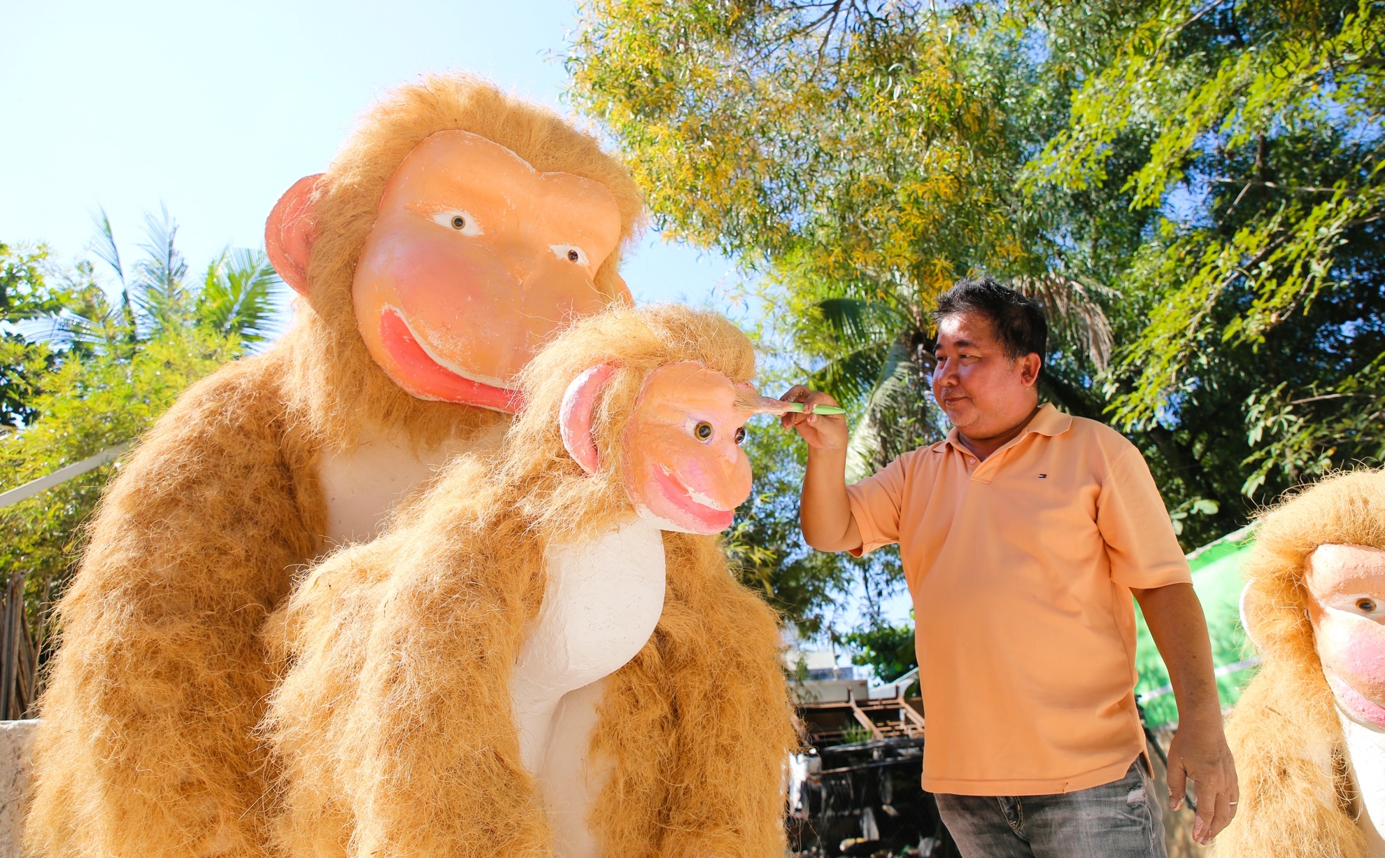 | Nghệ nhân Phương chia sẻ, ý tưởng bố trí các chú khỉ thành gia đình biểu hiện cho một năm mới đoàn tựu, sum vầy, sung túc. Vẻ mặt các linh vật sinh động vui tươi để đón năm Bính Thân đạt nhiều thành công. Ông Phương chia sẻ, thi công linh vật phải qua nhiều công đoạn tạo hình bằng mút xốp, khuôn ốp thạch cao, quét keo, phủ xơ dừa tạo lông, sơn màu.