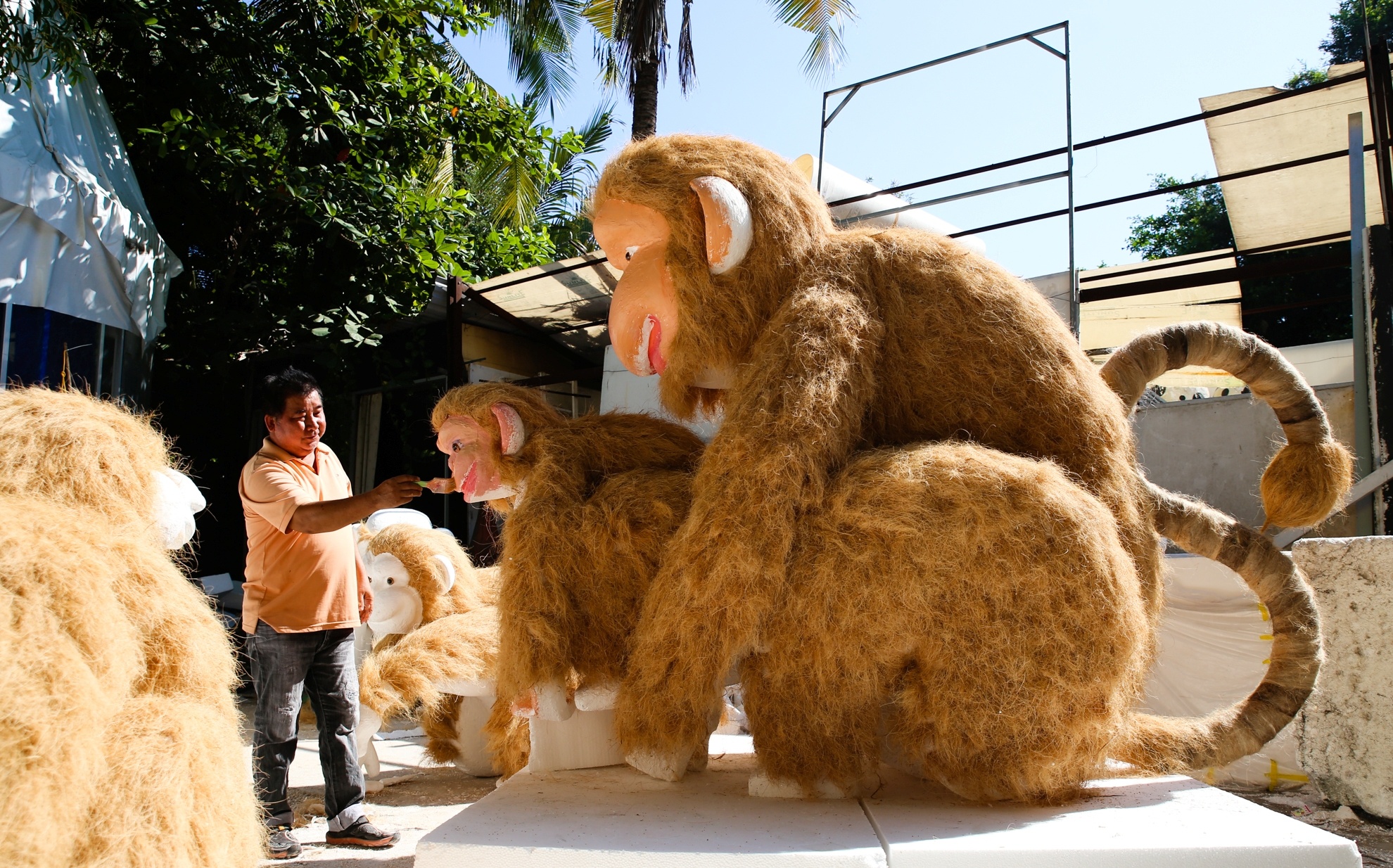 Nghệ nhân Nguyễn Minh Phương cùng nhiều công nhân đang gấp rút thi công 9 linh vật khỉ cao từ 1 đến 2 m cho đường hoa Tết Bính Thân 2016.