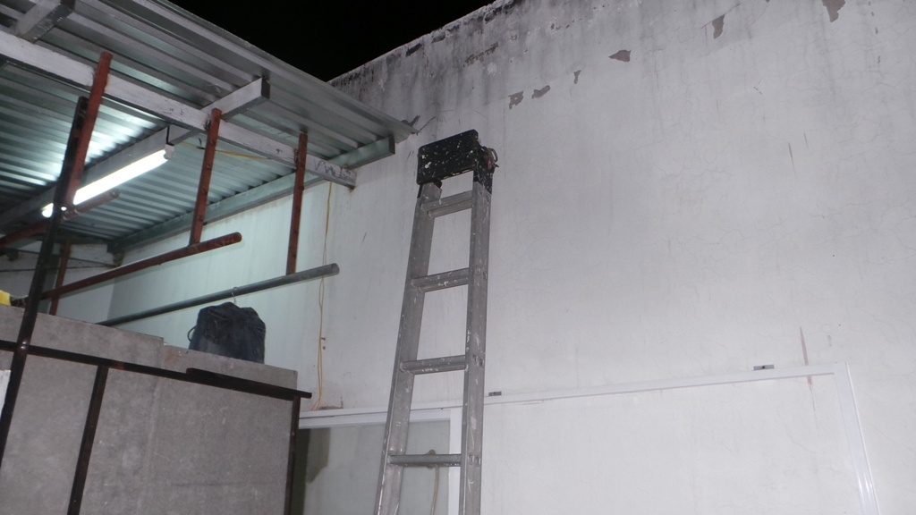| Chạy đến cuối nhà hàng, Phong rẽ vào một căn phòng nhỏ có cầu thang dẫn ra khu vực để máy lạnh. |