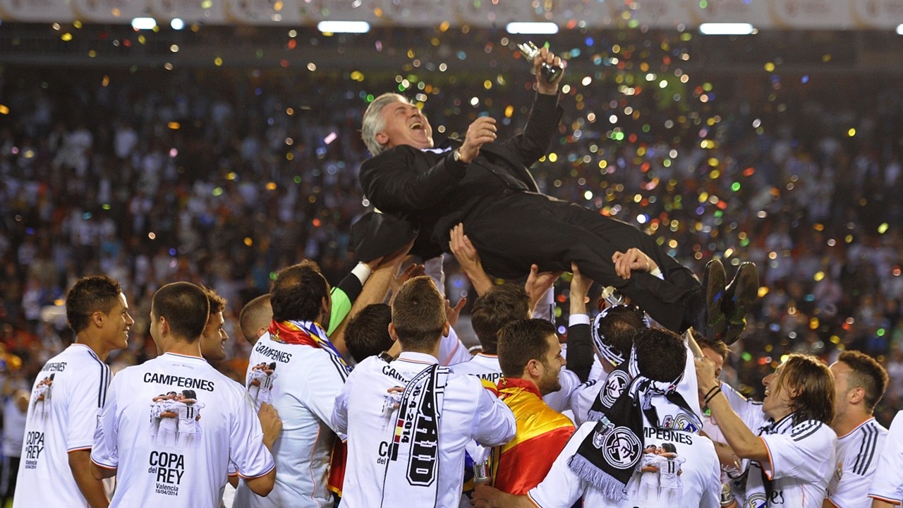 | Trong trận chung kết tranh Cúp nhà vua với Barca ngày 16/4/2014, Gareth Bale tỏa sáng ở những phút cuối, giúp Real giành chiến thắng với tỷ số 2-1. Đây là danh hiệu đầu tiên của Ancelotti tại Bernabeu. Ảnh: Blogfcb. |