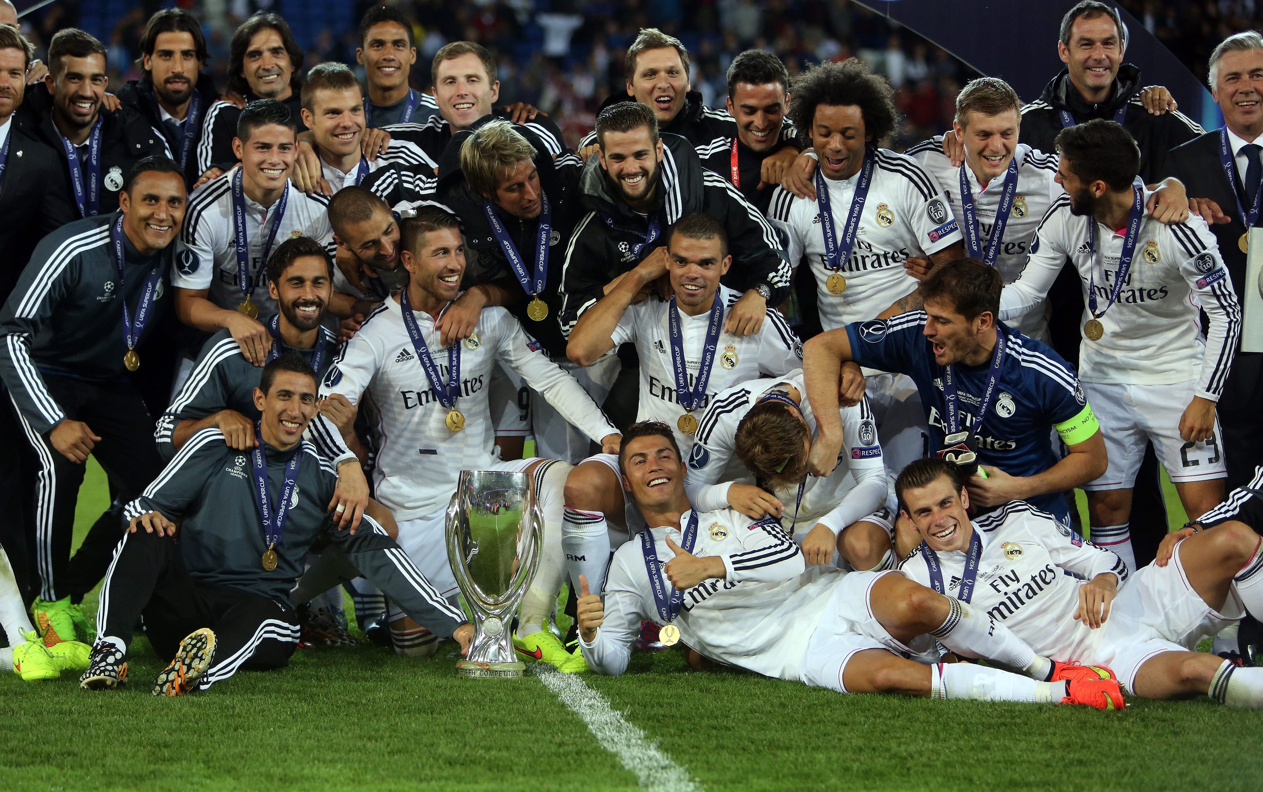 | Trước khi bước vào mùa 2014/15, Ancelotti đưa về phòng truyền thống tại Bernabeu danh hiệu Siêu cúp châu Âu. Đội bóng Hoàng gia đánh bại Sevilla với tỷ số 2-0 nhờ cú đúp của Cristiano Ronaldo. Ảnh: Scmp. |