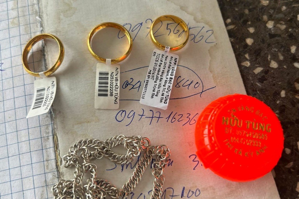 Tài sản bị đánh rơi gồm 3 nhẫn vàng và 1 dây chuyền bạc. Ảnh: Công an xã Cẩm Trung, tỉnh Hà Tĩnh/Facebook. |