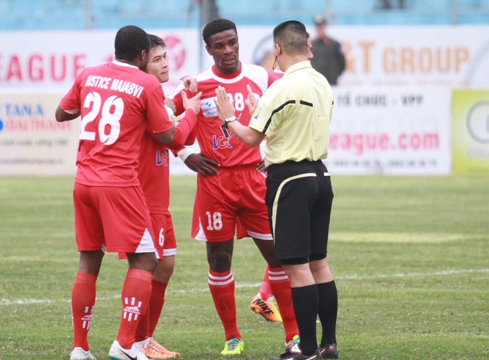 | Cầu thủ Hải Phòng phản ứng dữ dội với quyết định thổi phạt penalty của trọng tài Công Khanh. |