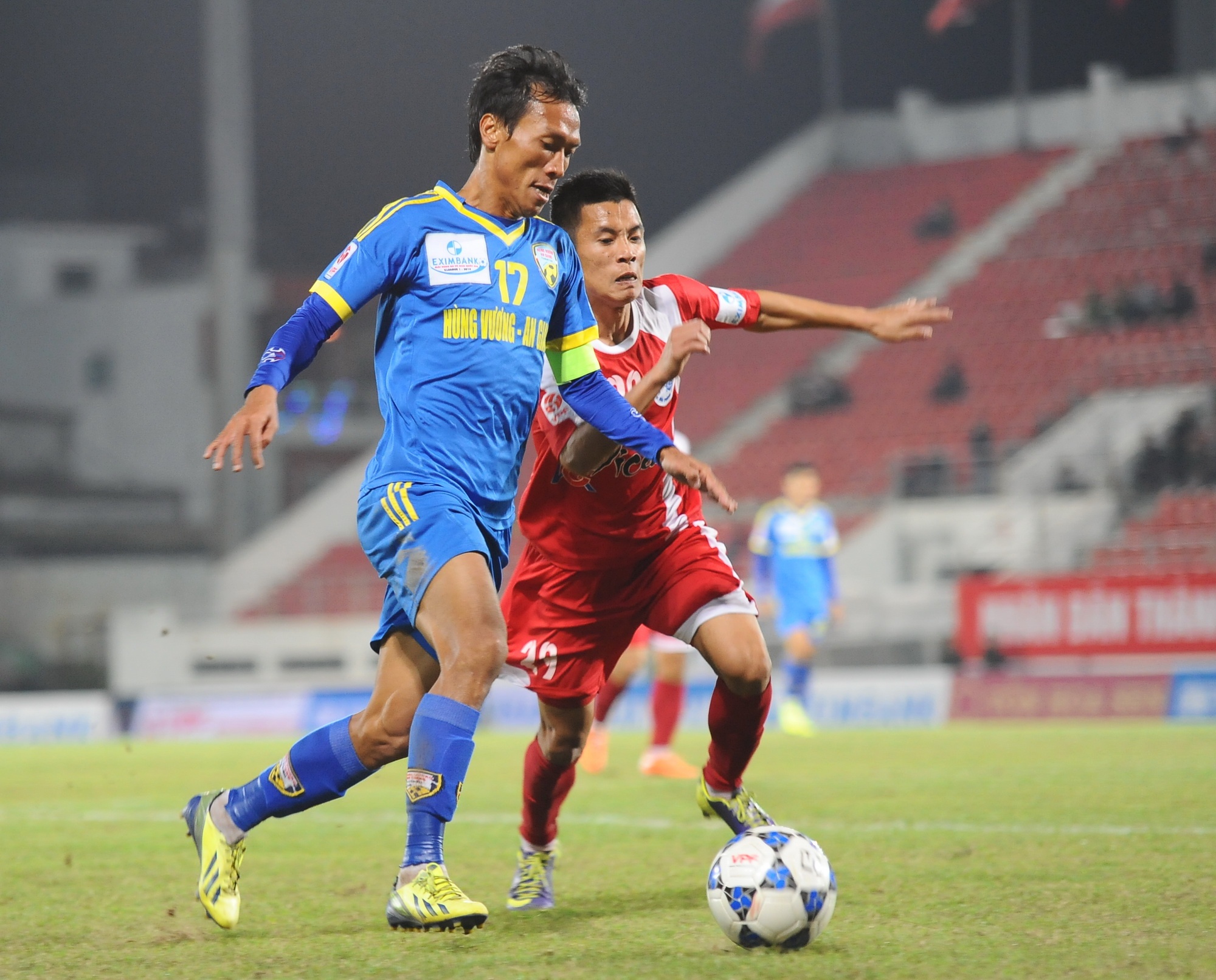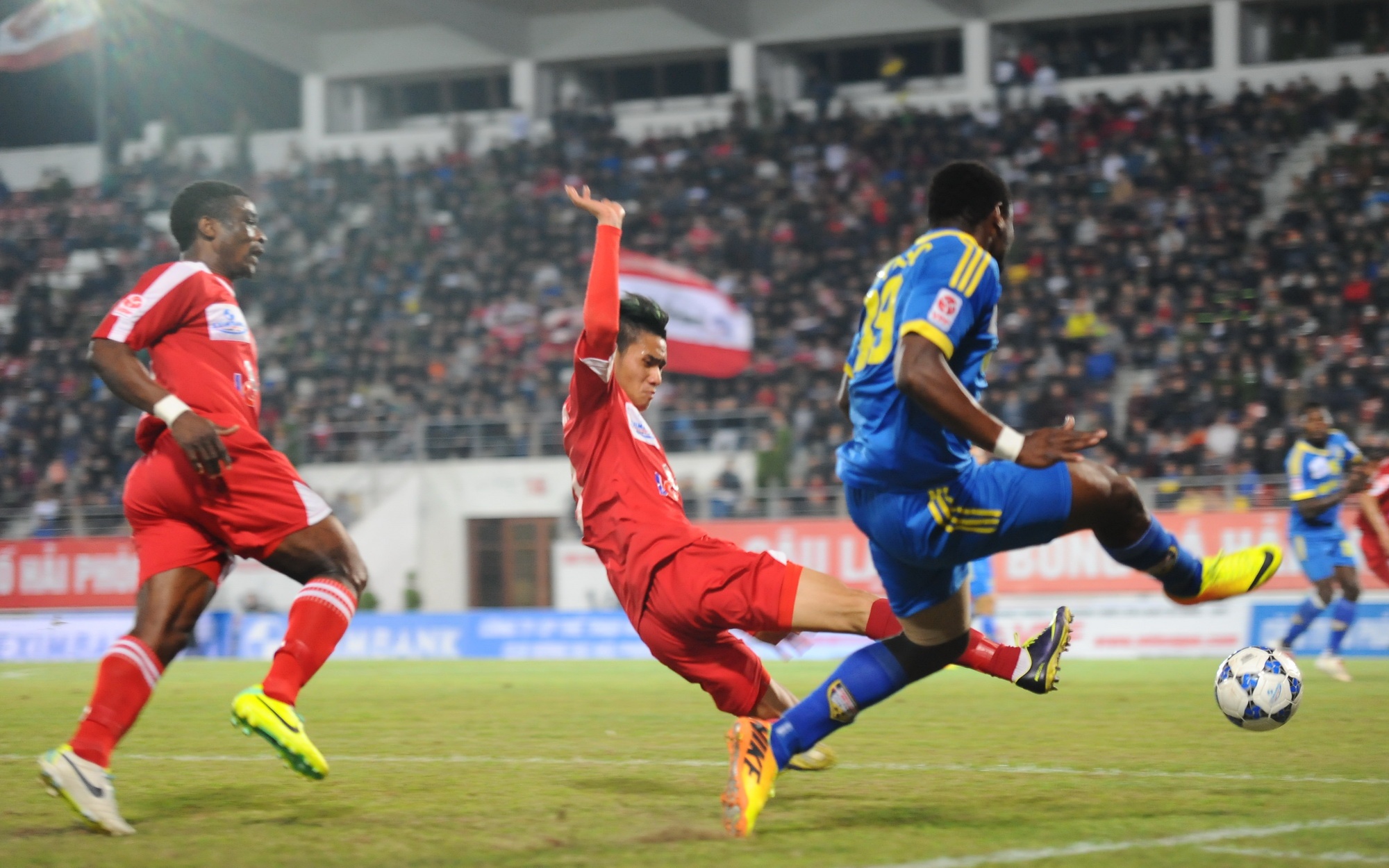 | Trung vệ hàng đầu Việt Nam một thời - Vũ Như Thành phải vất vả cản phá những pha dốc bóng của tiền đạo số 9 bên phía CLB Hải Phòng. |