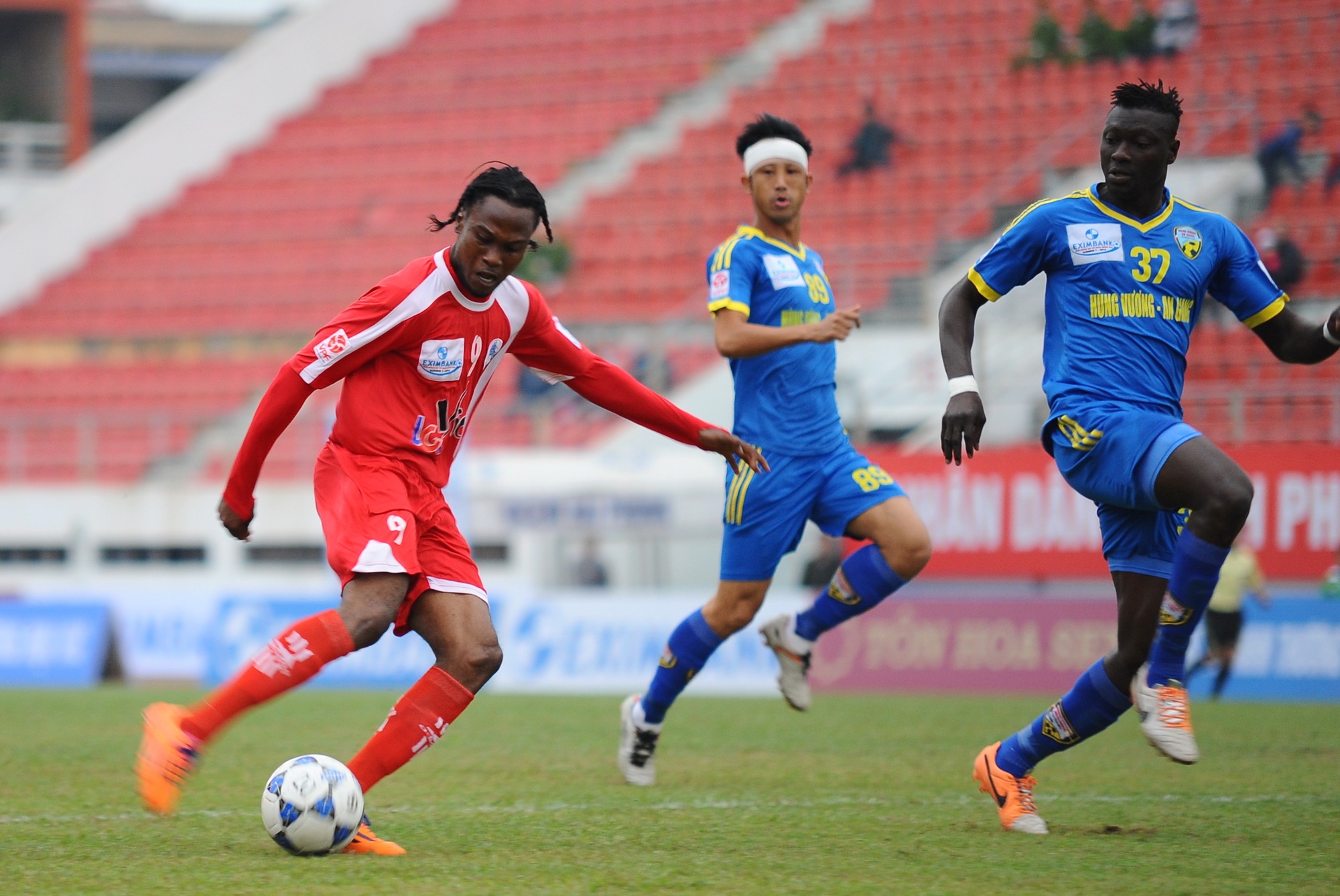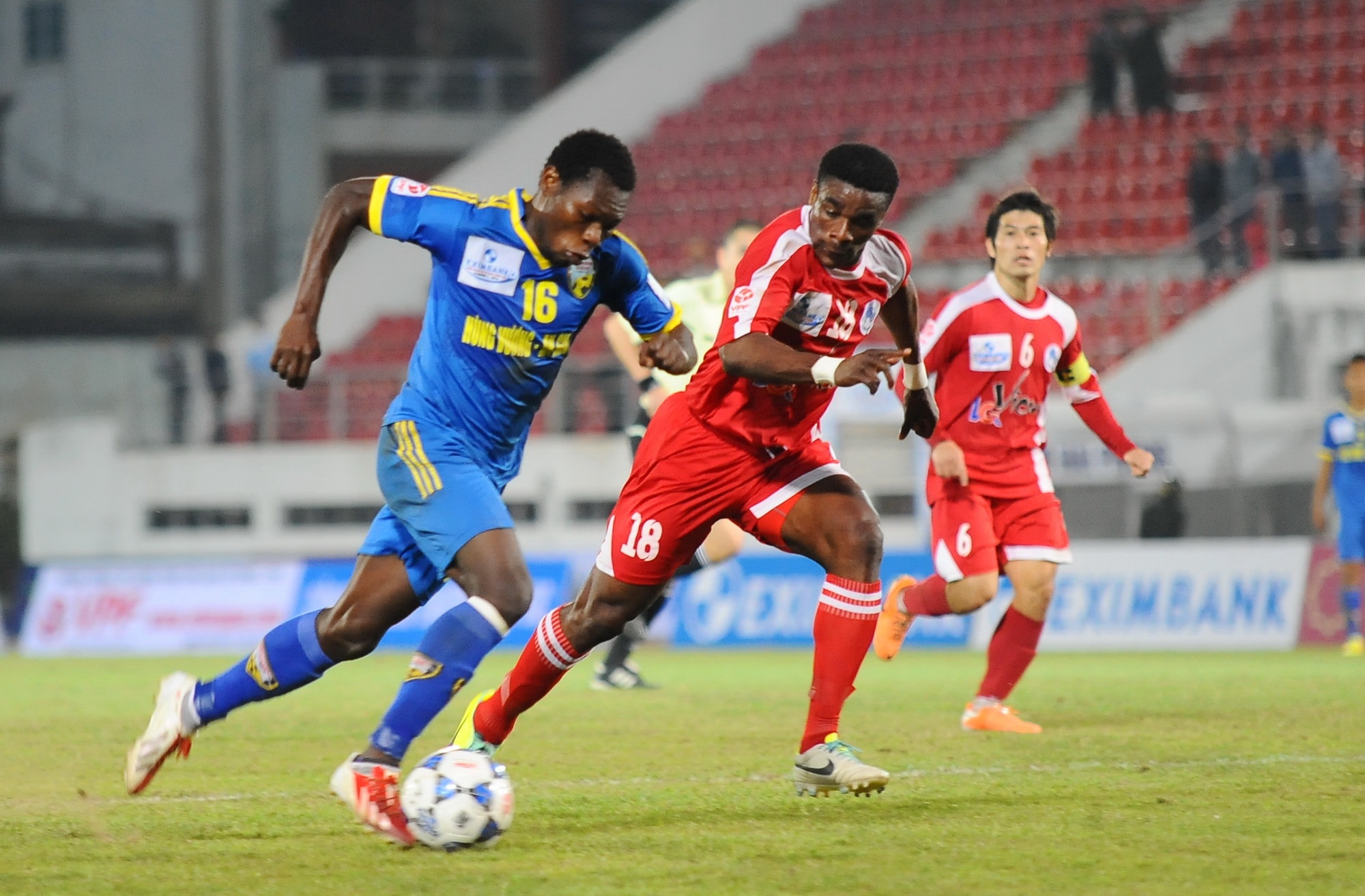 | Diego Fangan thể hiện sức mạnh và tốc độ làm khuấy đảo hàng phòng ngự CLB Hùng Vương An Giang. |