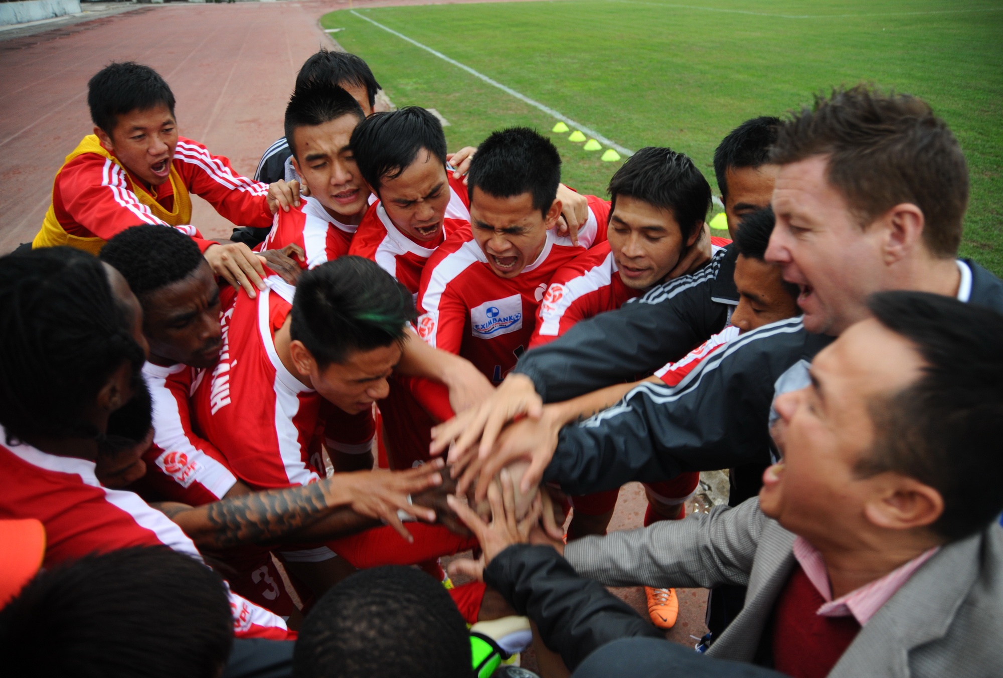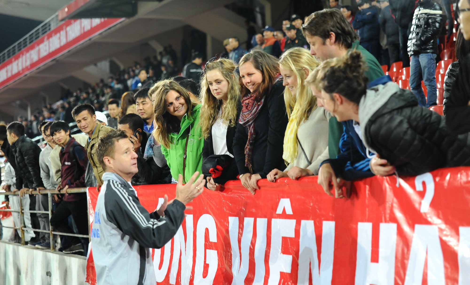 | Sau khi kết thúc trận đấu, một nhóm CĐV đồng hương đã tới khích lệ HLV người Anh Dylan Kerr. |