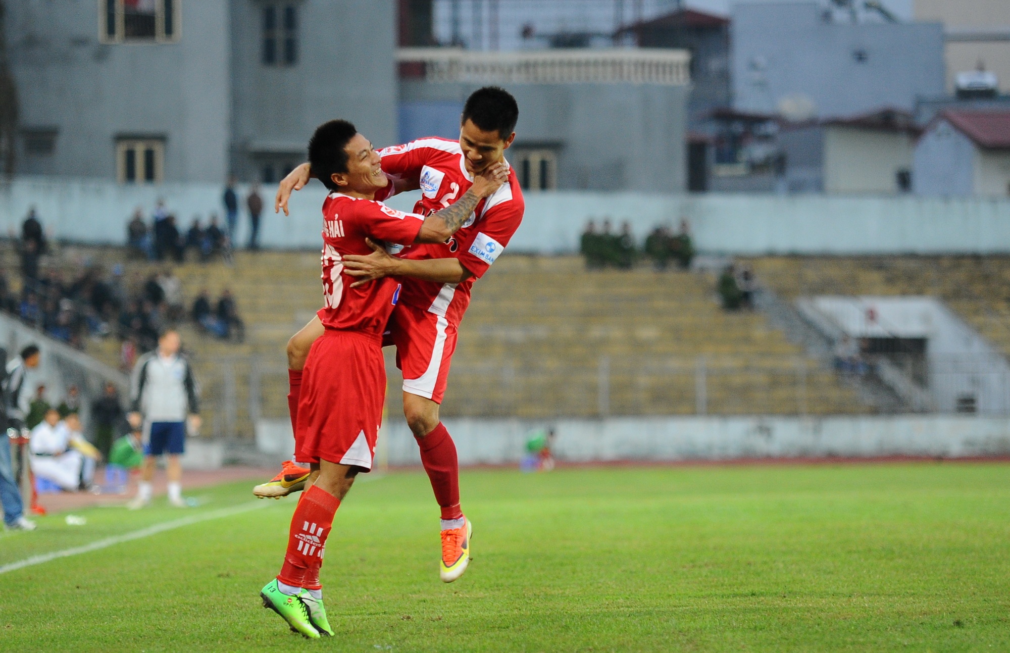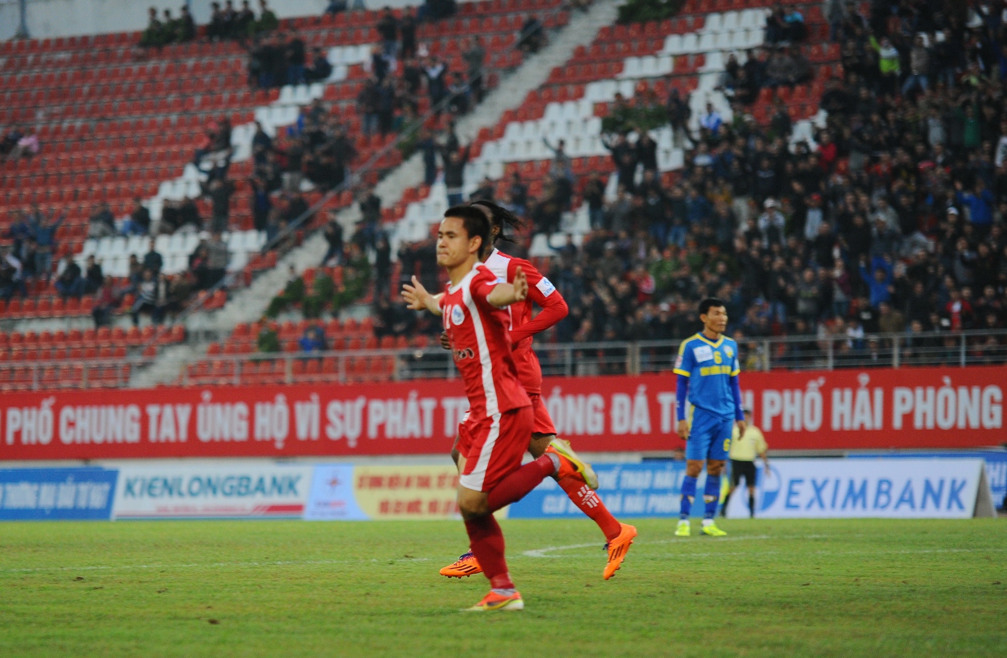 | Phút 36, Hoàng Đình Tùng nhận đường tạt bóng từ Quang Hải đánh đầu tung lưới thủ môn Phan Văn Santos mở tỷ số cho Hải Phòng. |