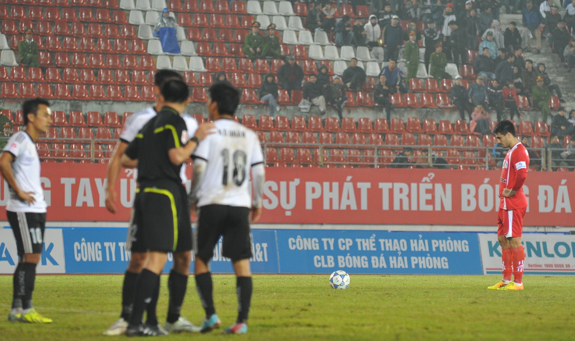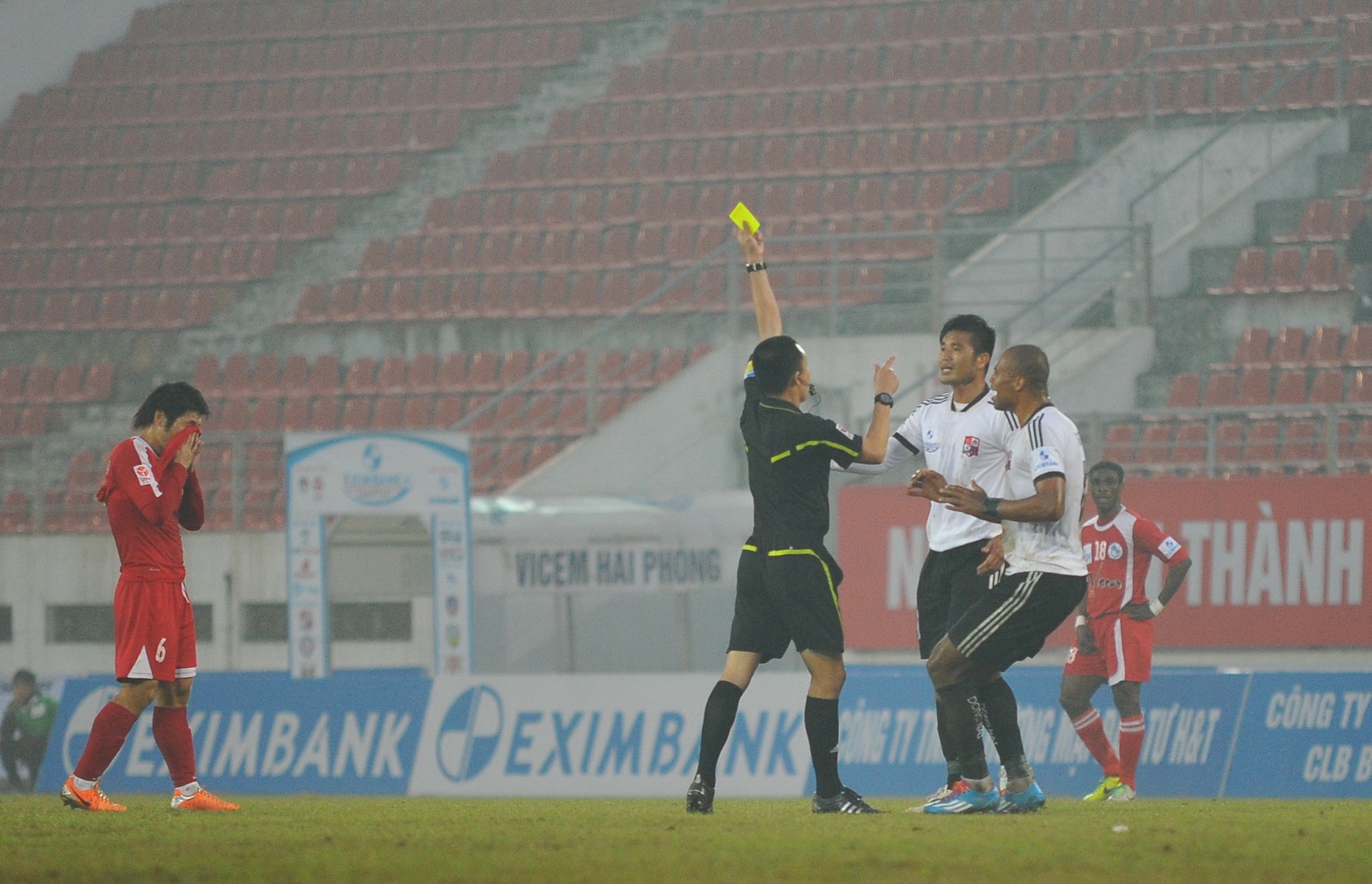 | Trận đấu trên sân Lạch Tray khiến trọng tài chính Trần Trung Hiếu phải rút tới 8 chiếc thẻ vàng chia đều cho cầu thủ 2 đội.