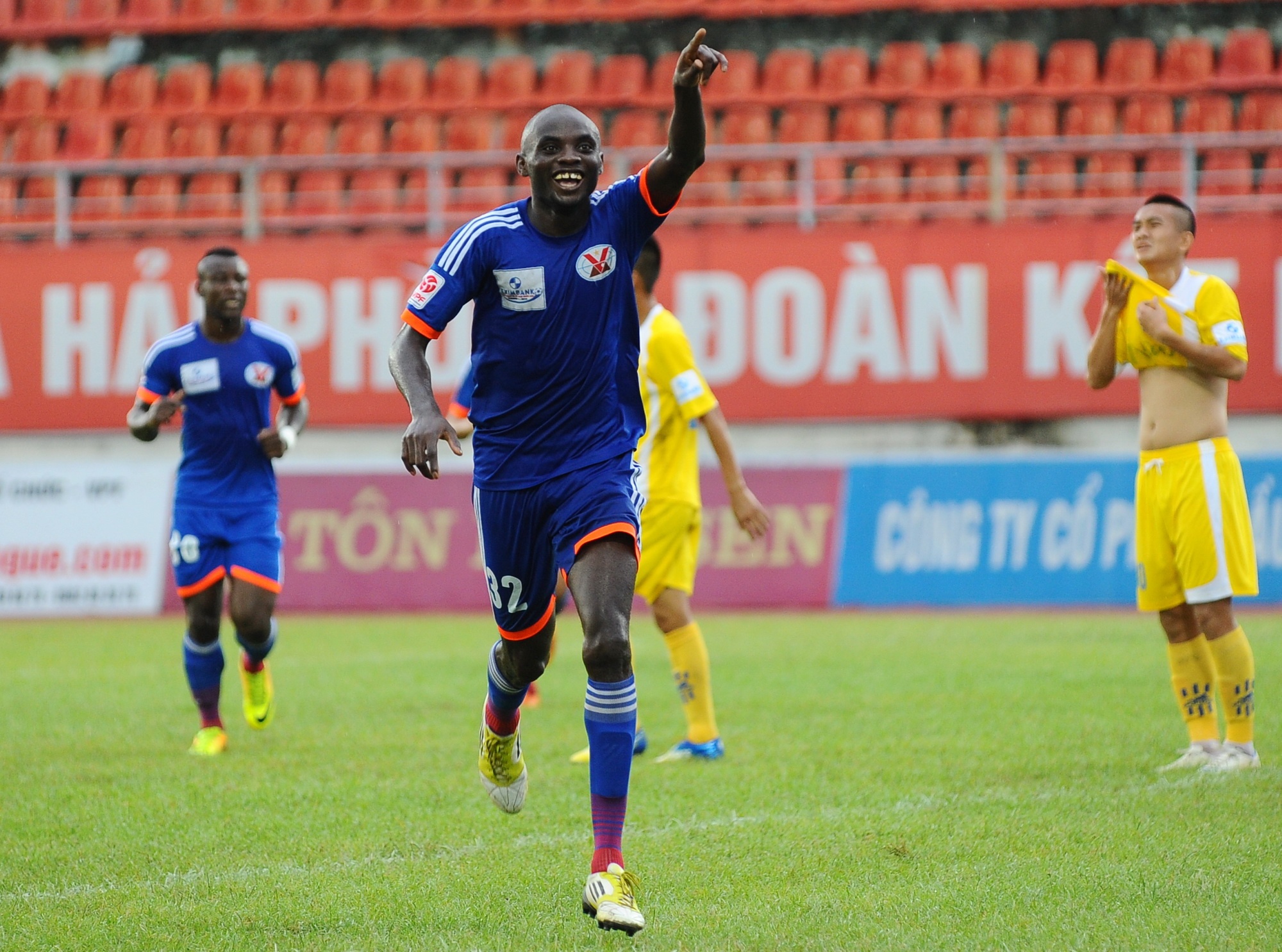 | Uche chạy đến phía khán đài có CĐV Than Quảng Ninh ăn mừng bàn thắng ở phút 16.